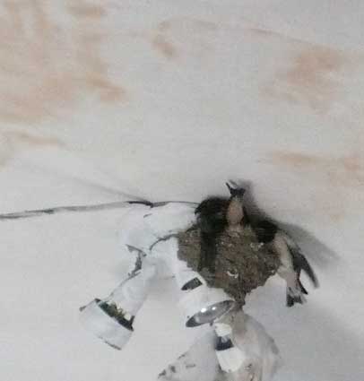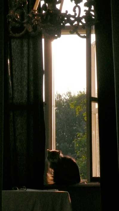 oben erjagt die liebe Katze die lieben Jungschwalben auf dem Boden