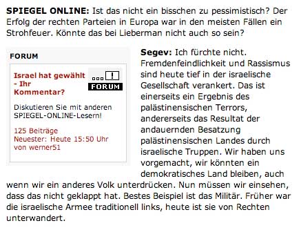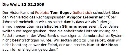 Ein Hauptargument für die Existenz Israels war immer weltweit und als Begründung ihrer Brückenkopf-Funktion für die USA in die Länder des Öls, dass diese Neugründung eines Staats mit UNO Garantie die einzige Demokratie der nah-östlicher Region sei. Nun sehen wir dort Menschenrechte missachtet, die UNO bombardiert, die USA lächerlich gemacht, wir hören die dortigen Wähler nach starken Führern rufen und Morddrohungen schreien. Aus dem Lande selbst sagen besonnene Kommentatoren, Haider, der solches nie sagte oder tat, wäre von Europa wegen Verletzungen demokratischer Standarts geächtet worden, und heute sehen wir kein Land Diplomaten abziehen, Einreiseverbote aussprechen oder auch nur Mahnungen werden hörbar.