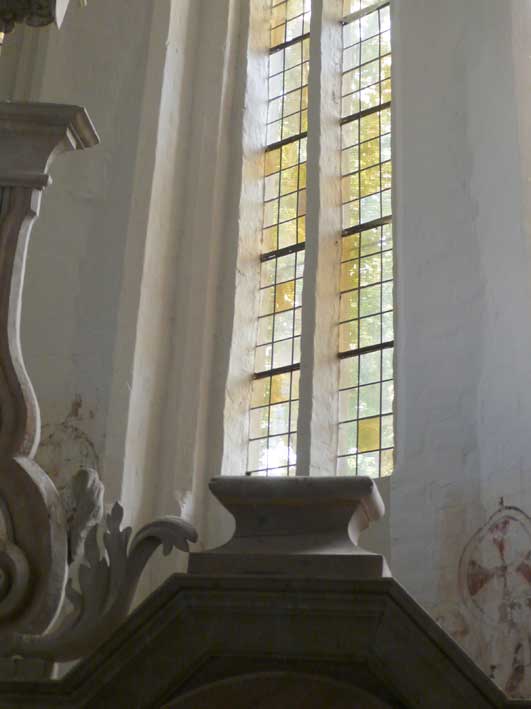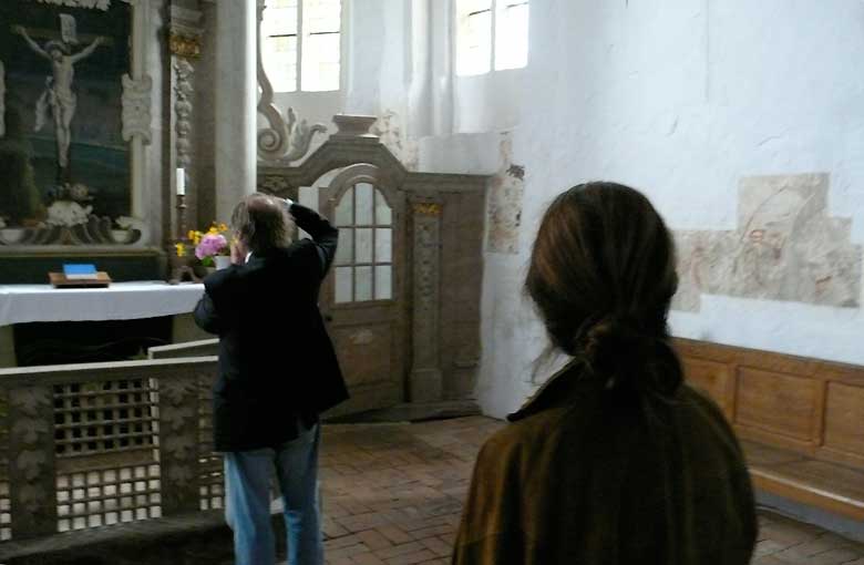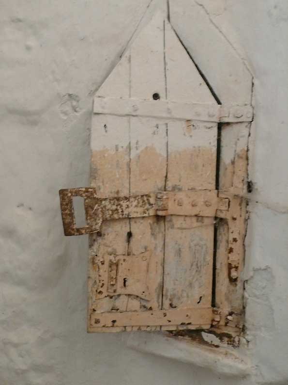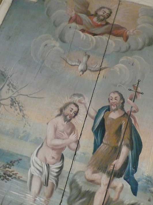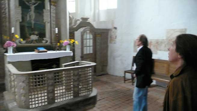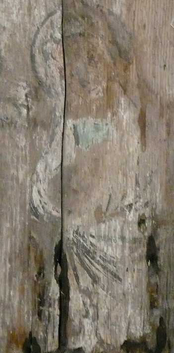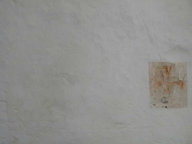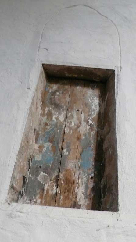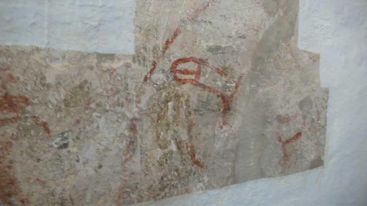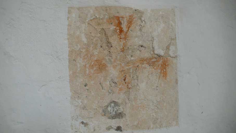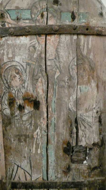 Der Sanktuarien-Schrein mit der Malerei auf der Innenseite der Tür die Kreuzigung mit den beiden Marien. Die Maria(Namensgeberin der Kirche)in der Wand ist nahezu unkennttlich.