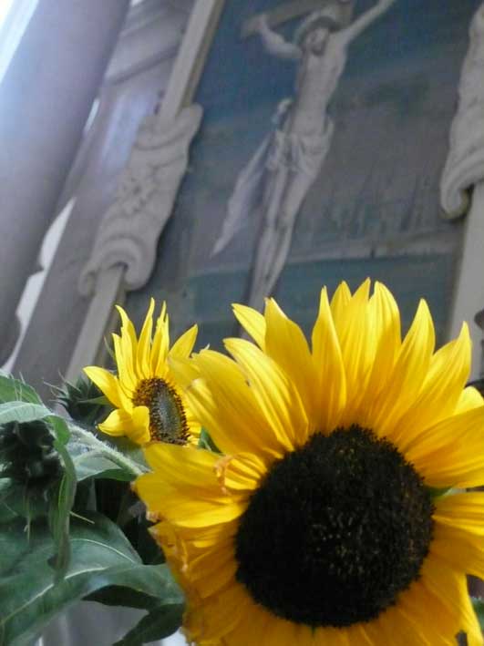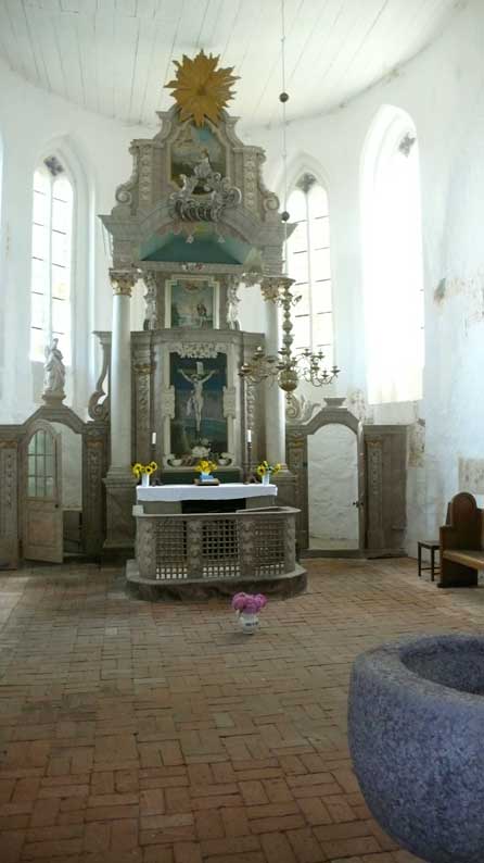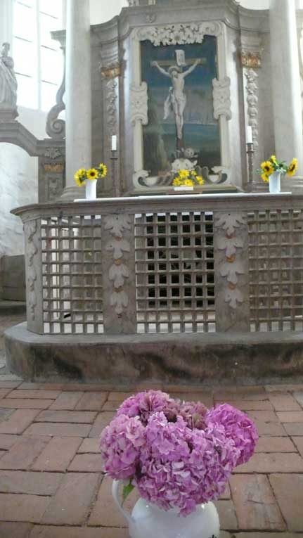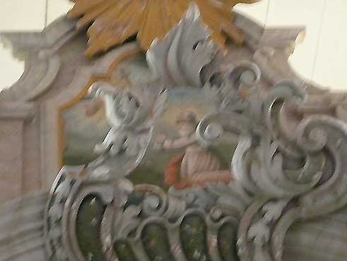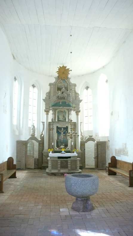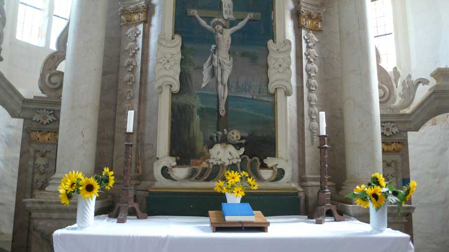 Das Programm wäre Altarbild Kreuzigung. darüber die Taufe und oben das Gebet auf dem Ölberg. Das alte Gehäuse unter seinem geistigen Dach von Generationen.