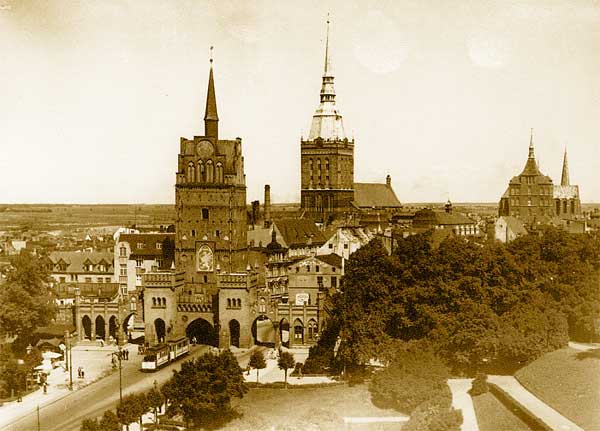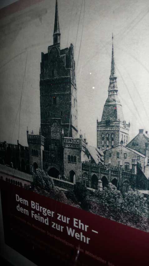 Da im Schaufenster ist sie noch und wieder St. Jakobi plus Kröpeliner Tor in alter Fassung.