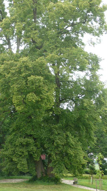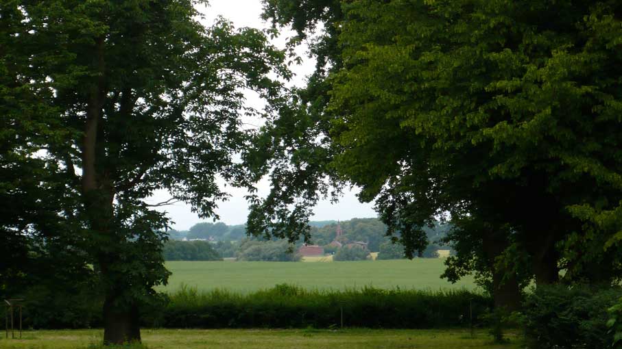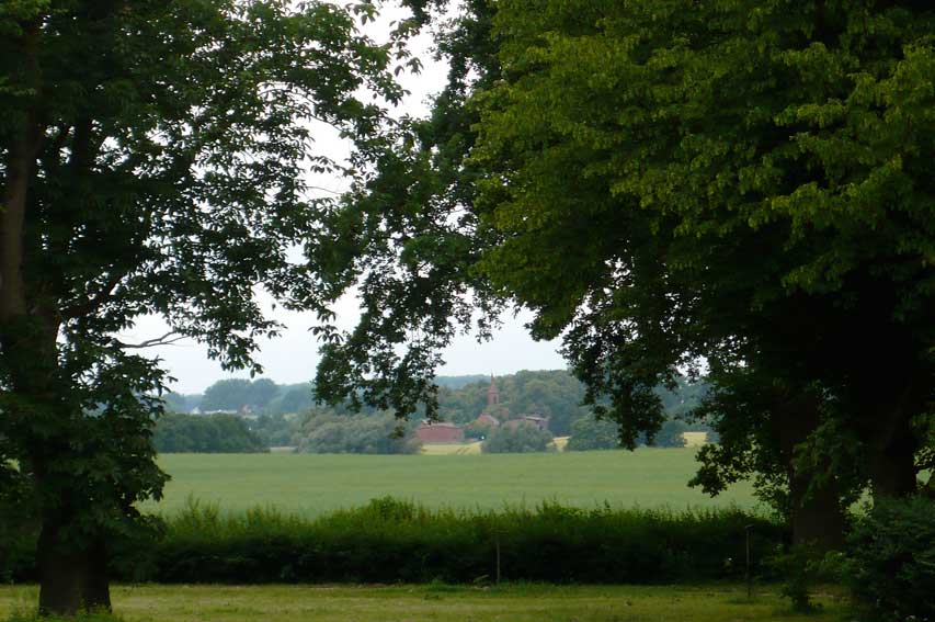 Ganz hinten hinter den Feldern, durch die Bäume sieht mans, die Kirche von Bredenfelde. Den Turm. Und das ist wieder eine eigene Geschichte, und so in Schwandt, der Schlieffens(Schlieffenplan 19149, gleich nebenbei.