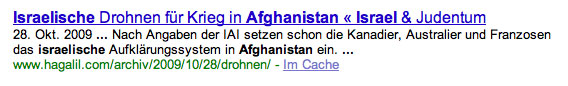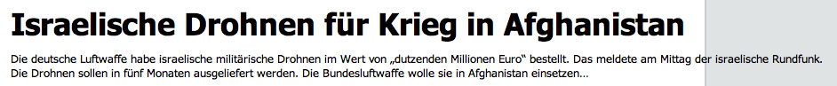 In Afghanistan, so hören wir, sind wir, die USA und das Expeditionsheer der Verbündeten, weil es um den Terror geht, der daher kommt und um der westlichen Werte. Schulen und Brunnen auch. Da darf keiner abseits stehen, der noch mitspielen will. Und Israel, das so hoch gerüstete, das von Terror bedrohte, der wichtigste Freund? von Israel nichts gehört. Keine Terrorbedrohung, keine Werte, keine Brunnen und Schulen für die Mädchen ohne Kopftuch. Israel hilft. Hat Erfahrungen, hat die Waffen, erfand das Töten ohne Urteil, von oben. Nach dem Urteil des weisen Rates, seiner Leute. Wir haben ein "Paralamentsheeer" lesen wir, wer befielt da die Toten von oben? alle sagen, die Mehrheit in allen Umfragen, wir nicht. Wer dann? schiessen, töten, sterben für Isreal? von oben. Wer ist oben. Mit bestem Wissen und Gewissen.Staatsraison, das was man einfach weiss und tut.