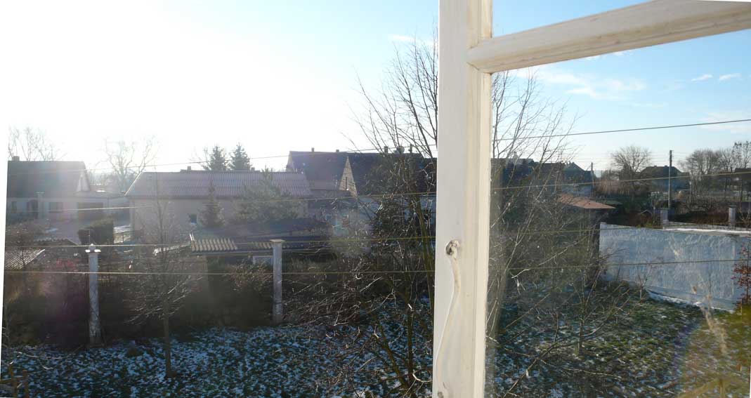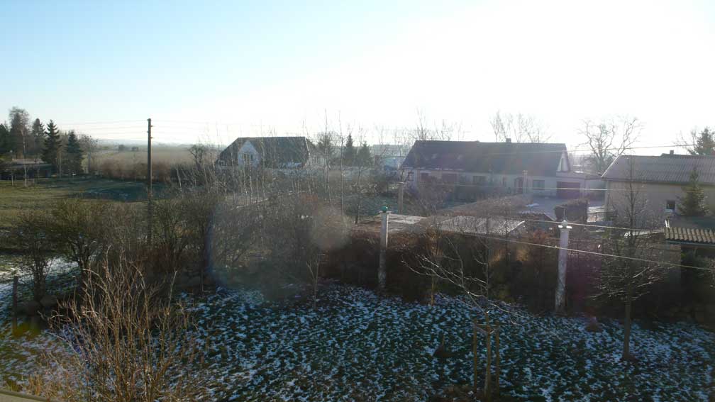 Der aktuelle Blick am Wintermorgen, aus dem Fenster des Kinderzimmers mit der verbotenen Kamera, durch 3 Instanzen. Aber am Ende doch mit einer erstrittenen