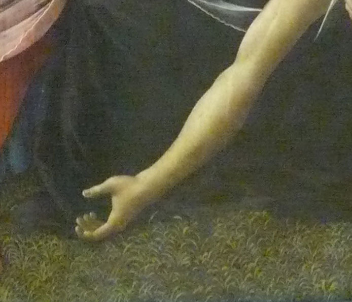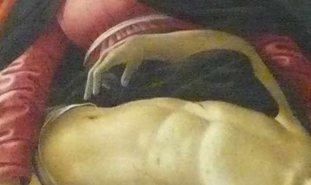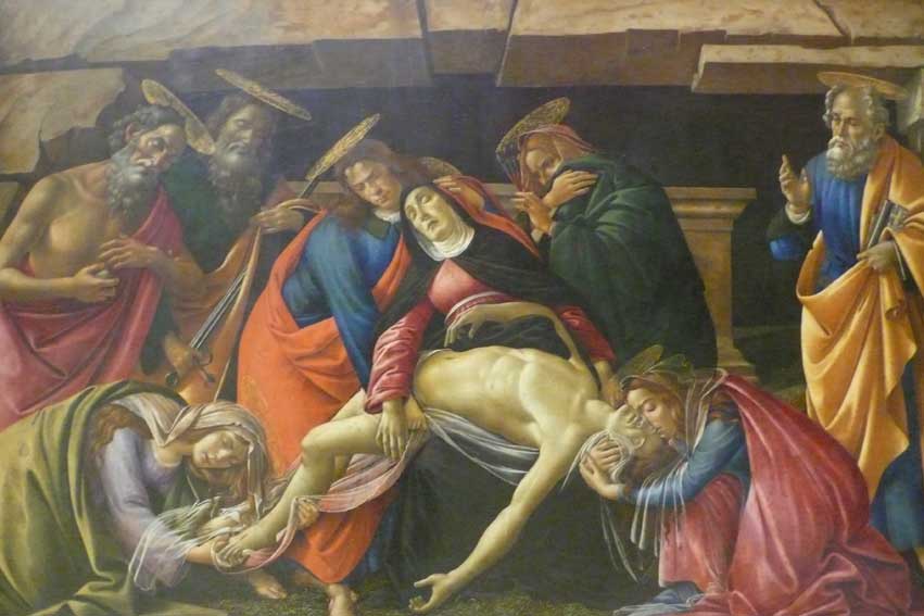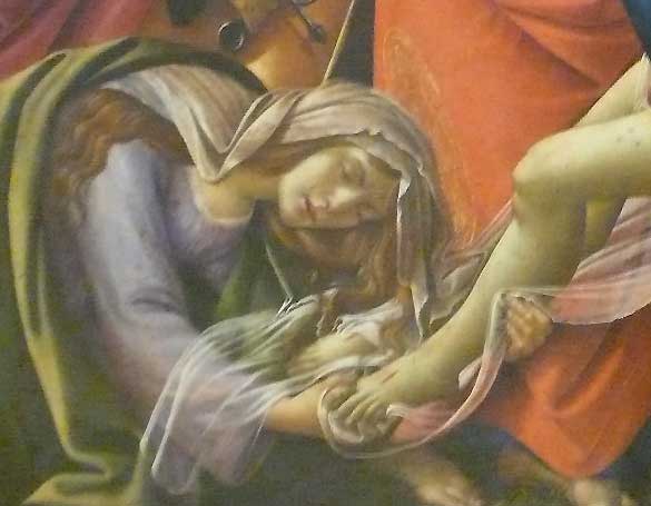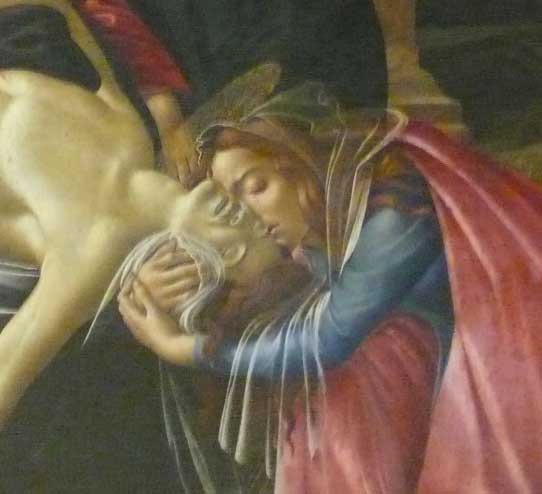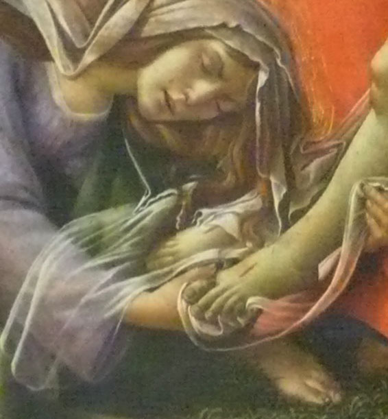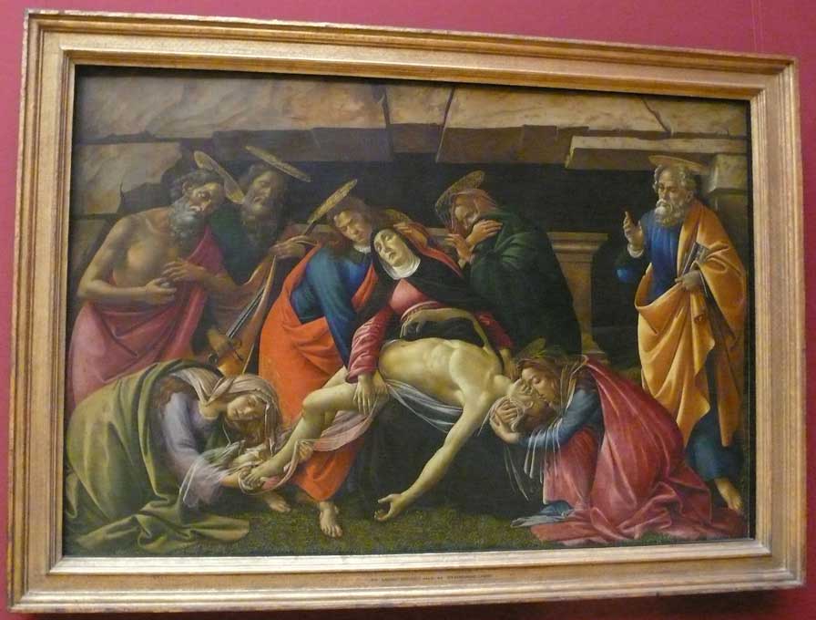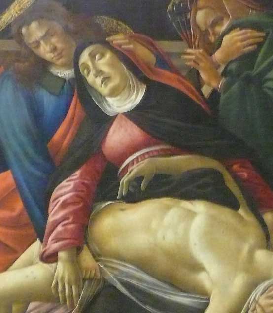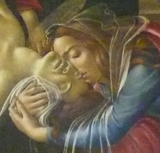 Bottichelli war mir lieb. Aus Florenz die grossen Bilder, wie man ihn kennt und liebt Geburt der Venus, Der Frühlung, die grossen Andachtsbilder und Frauen filigraner Natur. Dann dies. Sein letztes Bild. Es war die Inszenierung wohl, die ihn überzeugte, mit der ich dieses Bild beschrieb und deutete. Inszenierung selbst der Text.. Als Weltabschiedsgeschenk, das Bild. Die Innigkeit der Frauenszenen an Kopf und Füssen und über dem Bogen seines Leibes selbst mit der erhobenen Hand mag den betroffen haben, der damals am Beginn der Dinge ganz andere Interesssen hatte. Als Grab und Tod in fahlen Farben, wie das Bild auch nicht zu beliebten gehört.