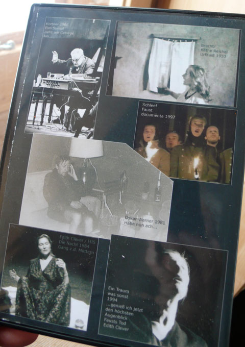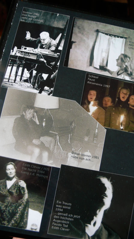 Sie führt durch das Leben. Auch dessen, der dies vorlegt. Vom ersten Film des Schülers auf 8mm bei Brecht, über das Promotions-Dokument vom alten Kortner, der hier zum ersten Mal das Ende des Faust uns liest und durch die Freunde als Gäste, Schleef auf der Strasse vor den Türen des verschlossenen schiller-Theaters in Berlin über und damit das Ende des klassischen Theaters überhaupt zur hinterlassenen Gabe des letzten Oskar Werner ohne Theater zuletzt, zu der Frau, die den Gang zu den Müttern entdecken hilft wie nie und die den alten Faust nun noch mal zu einem Ende führt wie wohl ihr Grechen am Ende allles auffängt und löst. Im Film.