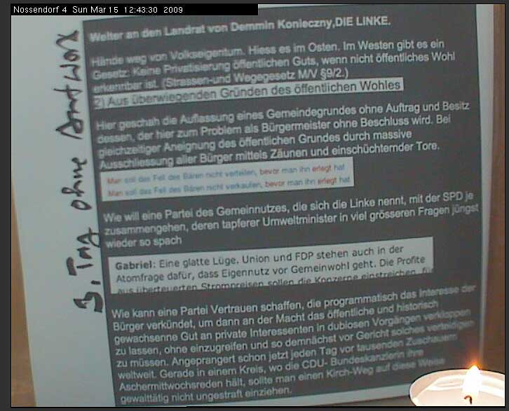 Man kann natürlich sagen, nur ein Dorf, wenn wir uns um die Probleme jedes Dorfs kümmern sollten, wo kämen wir da hin. Aber es ist ja kein normales Dorf. Am Ende der Welt, bemühe ich mich seit 9 Jahren mit öffentlichen Notizen (7 Millionen Besucher inzwischen weltweit seitdem und täglich 3000-5000) und live-Schaltungen nach Paris 2003 Brüssel 2004 und Schwerin 2008 wie zur Zeit täglich von 4 Kameras dies Dorf zu einem Modell-Dorf zu machen, als Artefakt, aber auch wie Demokratie auf dem Lande im Osten und Kleinen funktioniert. Und das tut sie hier bedenklich schlecht. Wie man genau sehen kann und lesen, verlotterte Verhältnisse, bei Nachfragen ohne Antworten, mit Rechtswidrigkeiten ohne Kontrollen, berühmten Abnicken und Gesetzen zur Farce verkommen. Das Sterben des Dorfs. Immer unter Einbeziehung der Nachrichten aus der Welt. Ein Experiment.