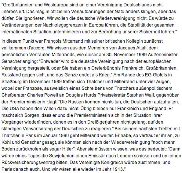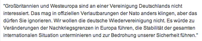 Die Unterlagen von Seiten unserer Partner in der westlichen Wertegemeinschaft -also der Werte wegen deren Verteidigung sie zusammengekommen waren- zur Wiedervereinigung Deutschlands und Europas liegen nun vor. Oft erklärte Werte wie Freiheit und Demokratie, also Selbstbestimmung wurden -von Frankreich und England- aufgegeben, zugunsten eigener Interessen, und das war: Deutschland klein halten, auf dem Niveau des kalten Krieges und der Niederlagen von 45. Interessant ist, was nicht in diesen Unterlagen steht, nicht steht ein Verlangen der Anerkennung östlicher Rechtsverhältnisse, also der Enteignung des Grundbesitzes nach dem Standard und Bestand der DDR- Rechte. Nachdem auch die SU (Gorbatschow) solche Forderungen nicht stellte, wer dann.