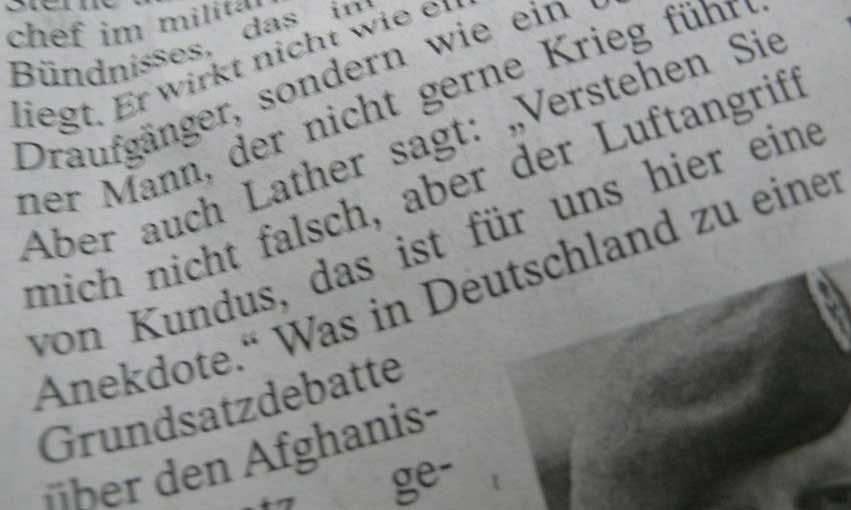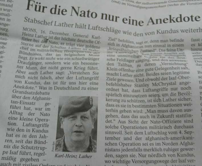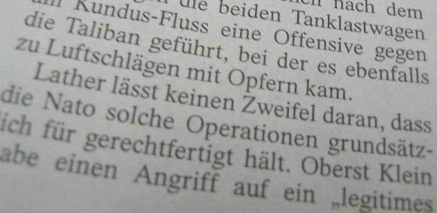 Wie denn das. Nur mit toten Feinden, inklusive Kinderleichen und zivilen Krüppeln, wäre das Vertrauen wieder herzustellen. Die sie nicht mal selber herstellen, aus der Luft, von den anderen durchgeführt. Mit Herumballern: immer feste druff. Bis die anderen sich weigern. Wer hätte dann die Soldaten falsch erzogen, sie nicht informiert wozu sie da sind und wie sie das erreichen müssen, damit sie sich verstehen, vertrauen können, ehrenvoll und stolz anerkannt zuhause, wie dort, wo sie stehen.