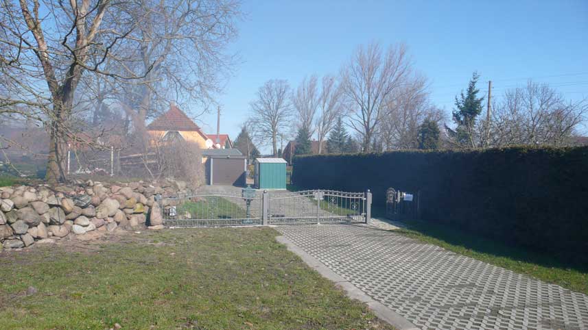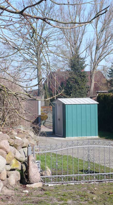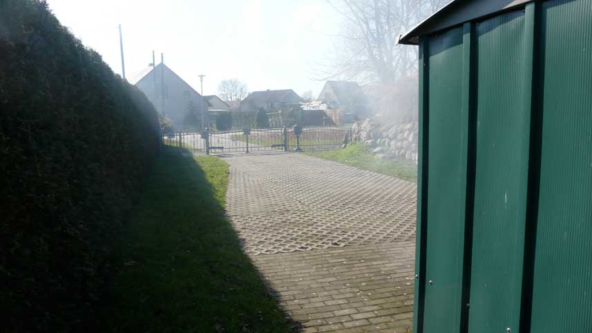 Das neue Eigenheim-Ensembles auf öffentlichem Grund. Was einst Weg war, wird zum Slalom durch Türen und Garagen und Hütten mit abweisender Bodenanlage, seit Herbst ganz schnell ohne Genehmigung. In Bayern Schiebung genannt. Hier von Bürgermeister arrangiert bei Nacht und Nebel, vom Amt in Demmin begünstigt von Anfang an bis heute.