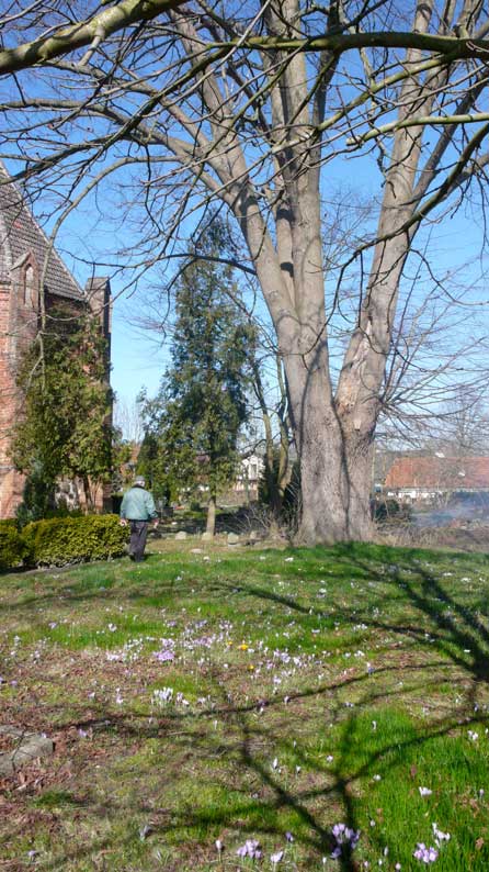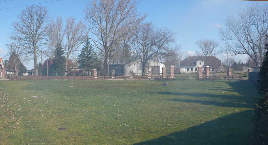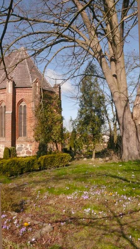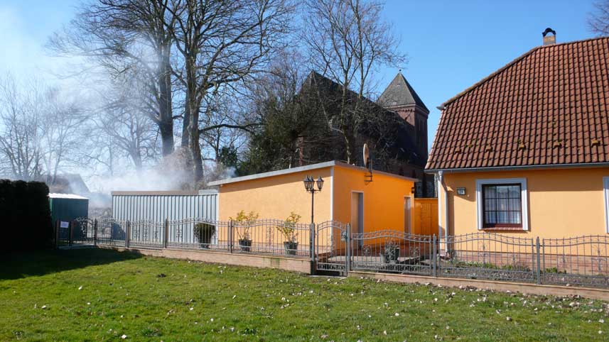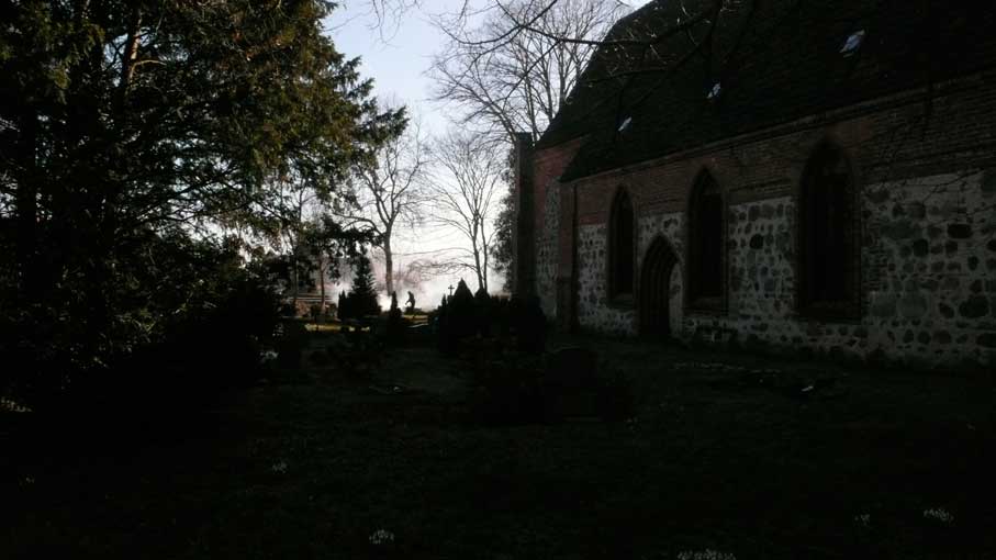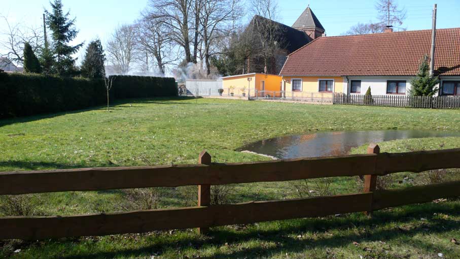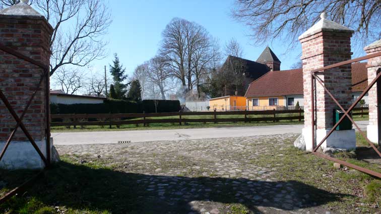 Gegenüber dem Haus durch das Tor die Kirche aus Feldsteinen und Backstein. Wie immer schon. Wo der Teich war, die Tränke der Pferde von allen Seiten zugänglich, Barrikaden. Gegen wen.