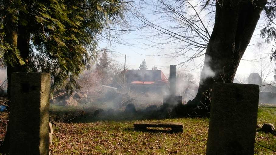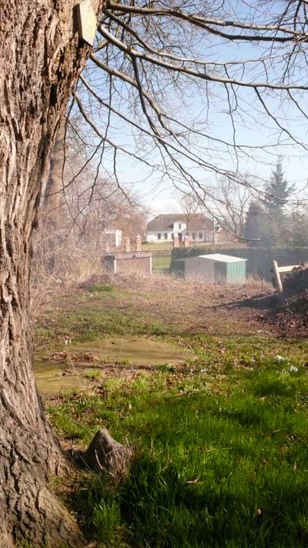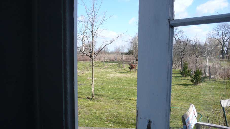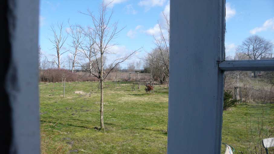 hinter dem Haus durch die Türen vorne und hinten unten am Graben -früher- der Tempel nun als Antwort der Kirche, zwischen neugepflanzten Bäumen vor den Feldern, bald in weiss. Am Waldrand in den wilden Wiesen und Gräben schreien am Morgen die Gänse jetzt wie ehe und je. Was mögen sie denken.