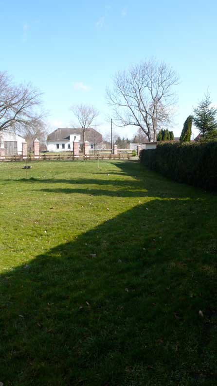 Das alte Ensemble der Achse von Gut und Kirche als geistiges Erbe noch zwischen durch Plastik und Beton und Zäunen gerade erkennbar. Mit etwas sorfalt der Hecken am and des Friedhofs wäre das Böse weg.