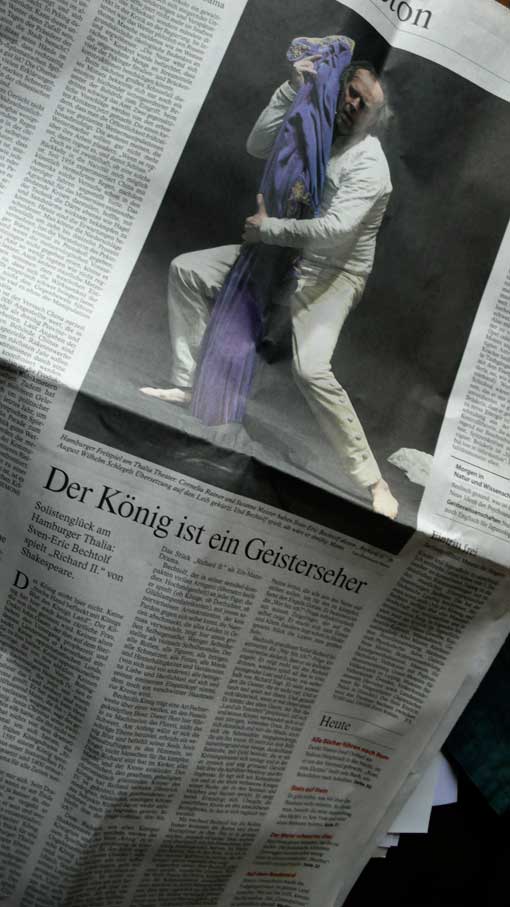 In Hamburg jetzt der ganze Richrd II als Monolog. Die FAZ feiert das. Leider durch einen, der verdächtig damals diese Form anlässich ihrer Erfindung als abendfüllender Kosmos der Kleist und Edith Clever Abende nicht erkannte und erst kürzlich das Ergebnis der Bilder davon wieder einem anderen zuschrieb, also kein zuverlässiger Zeuge. Kortner hat es nicht versucht, oder er ist nach dem Letzen Band abgetreten, fast. Oskar Werner, der diese Möglichkeit zuletzt erkennende für sich im Faust und Homburg, starb darüber.