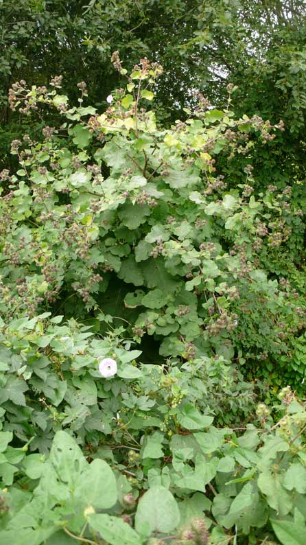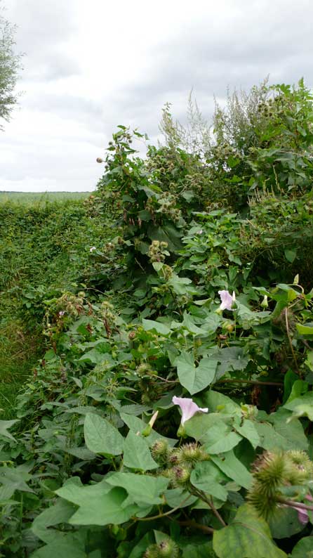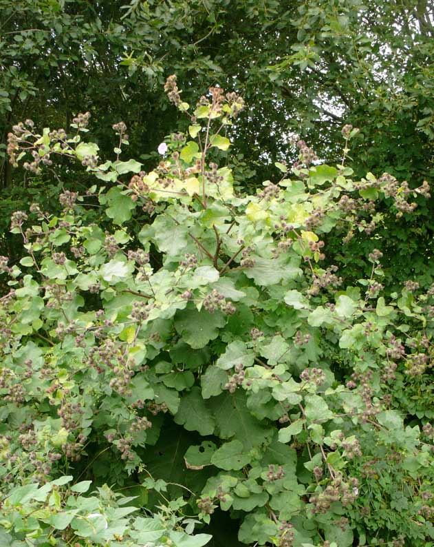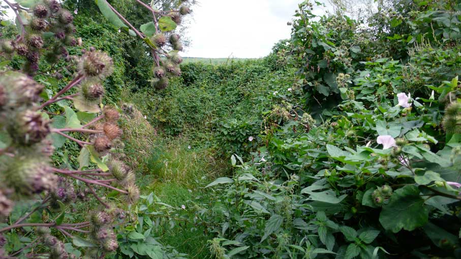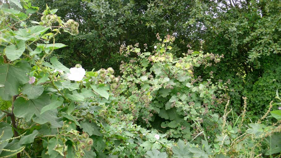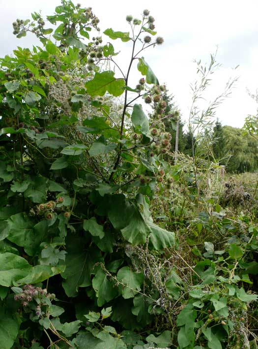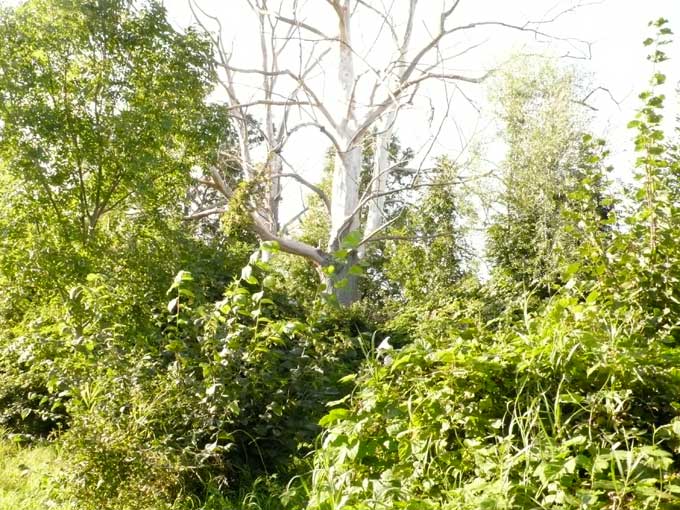 Etwas weiter hinten Baum-hohe Diesteln am Wasserloch, ausgetrocknet ohne Graben.