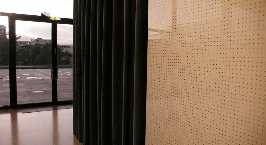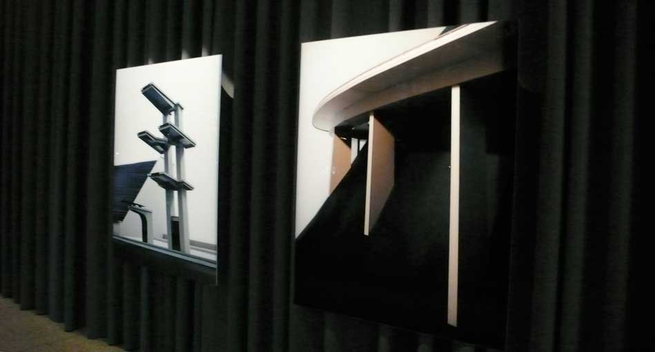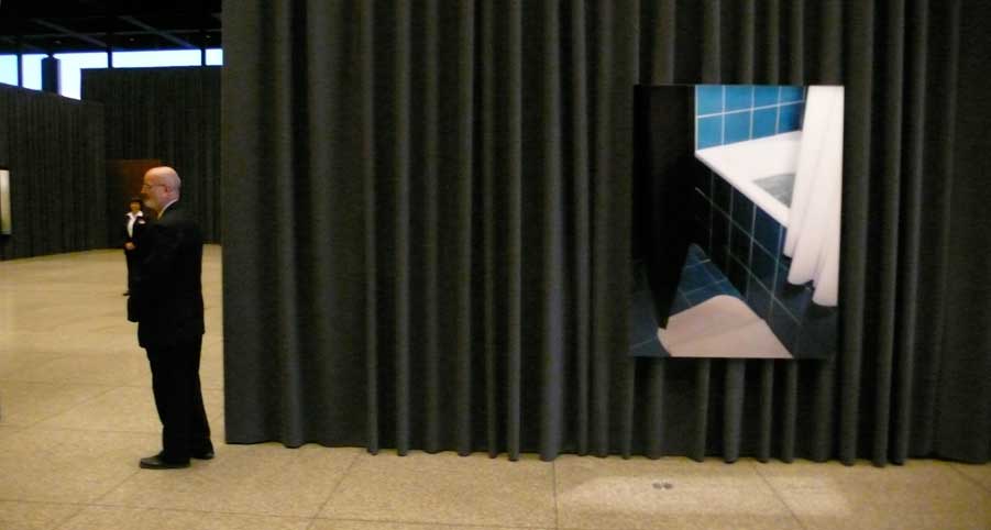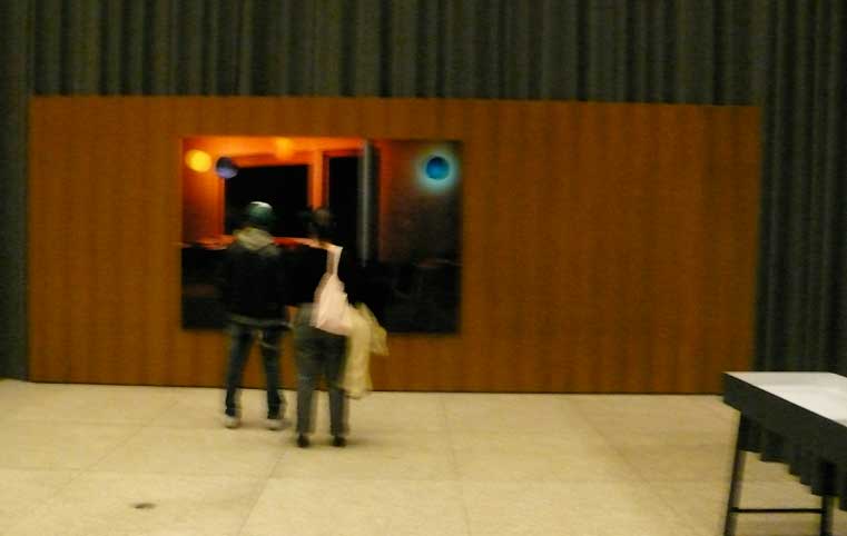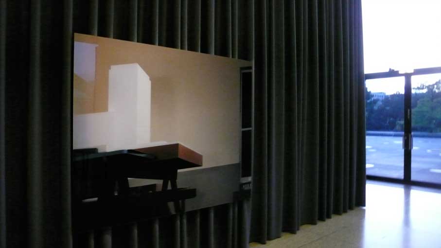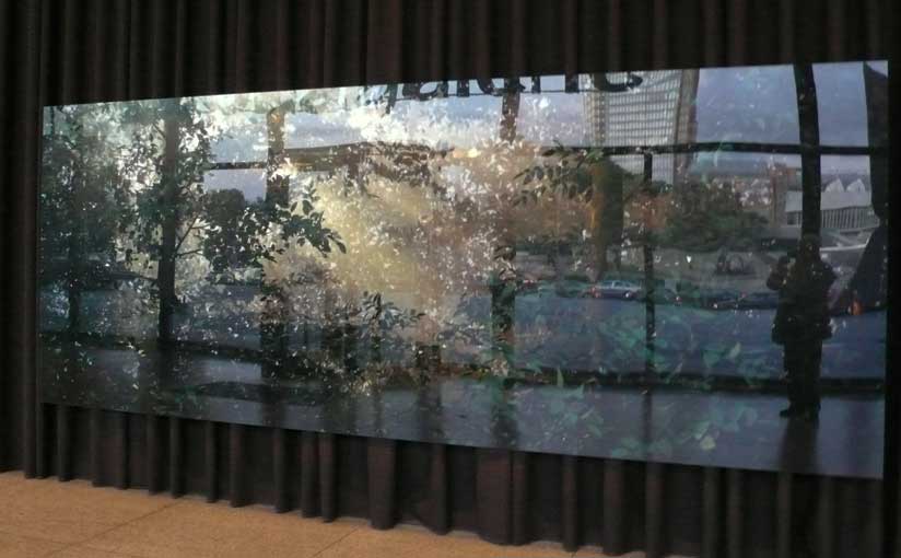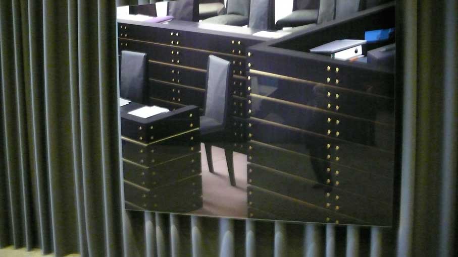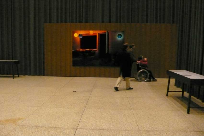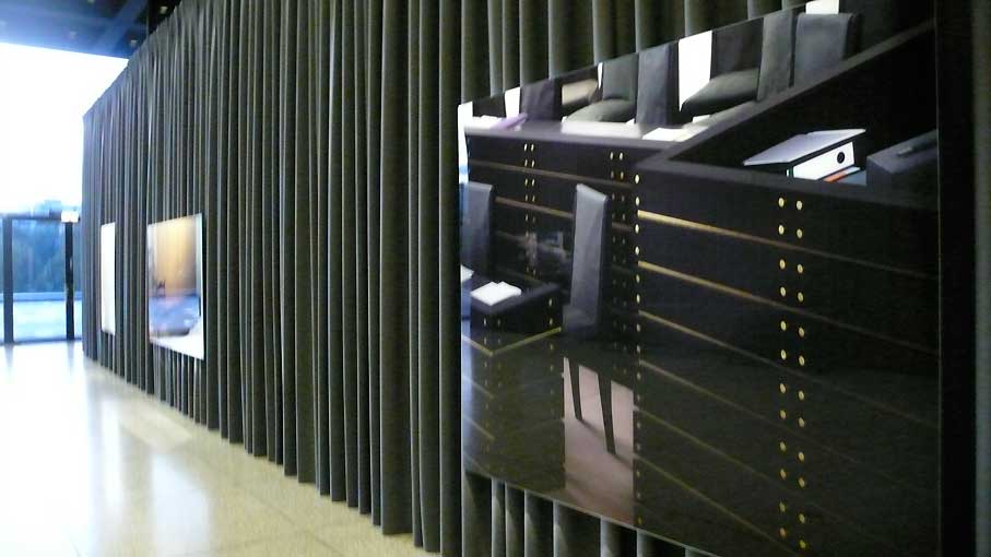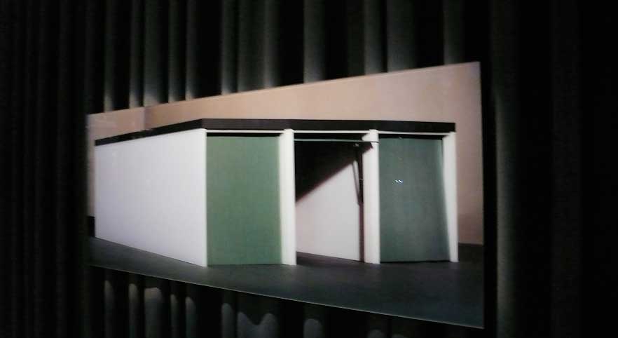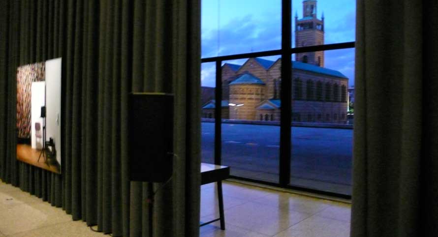 Die Demand-Bilder im Raum des oberen Glaskubus durch Vorhänge geteilt mit gelegentlichen Blicken und Spiegelungen vorbei und hindurch, schnell gesehen.