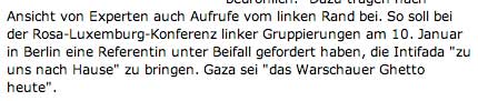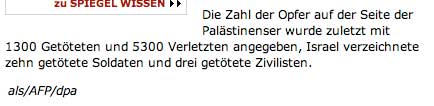 Fast alle westlichen Medien haben anfangs die offizielle israelische Propagandalinie wiederholt. Sie ignorierten fast vollstŠndig die palŠstinensische Seite der Geschichte, genauso wie die tŠglichen Demonstrationen des Israelischen Friedenslagers. Die BegrŸndung der israelischen Regierung (Der Staat muss seine BŸrger gegen die Kassam-Raketen verteidigen) wurde als die reine Wahrheit akzeptiert. Der Blick von der anderen Seite, dass die Kassam-Raketen die Reaktion auf die Belagerung sind, die anderthalb Millionen Menschen im Gazastreifen verhungern lŠsst, wurde všllig au§er Acht gelassen.