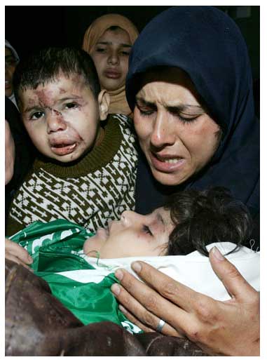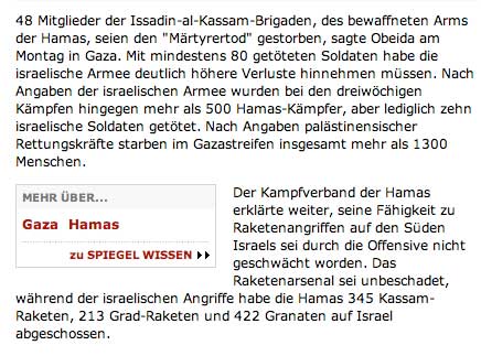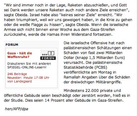Genauso lief es mit den anderen Schreckenstaten. Jedes Baby verwandelte sich mit seinem Tod in einen Hamas-Terrorist. Jede ausgebombte Moschee wurde sofort zu einer Hamas-Basis, jedes WohngebŠude ein Waffenlager, jede Schule ein Terrorkommandoposten, jedes zivile RegierungsgebŠude ein "Herrschaftssymbol der Hamas". Und so konnte sich die israelische Armee in ihrer Reinheit als die "moralischste der Welt" darstellen.