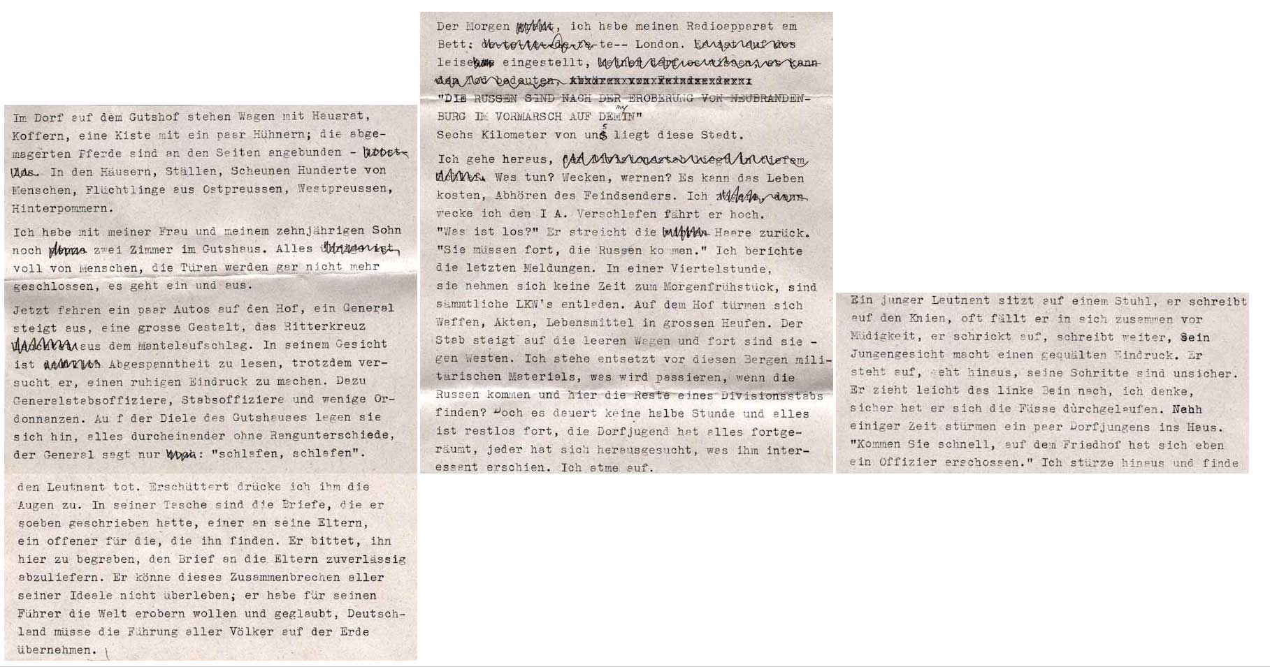 Auf diesem Friedhof auch der letzte der Toten des letzten Krieges, junger Leutnant wie er im ersten Weltkrieg, den der Vater begrub am Tag, bevor die Russen kamen, als er sich bei der Kirche, erschoss, wegen Erlöschens seiner Ideale, für die er in den Krieg gegangen.>>>