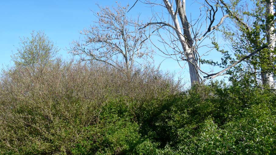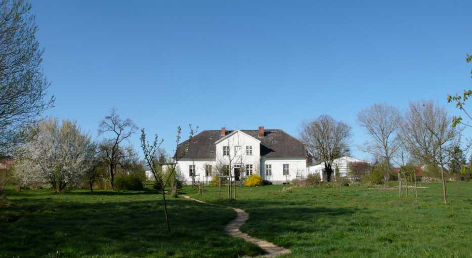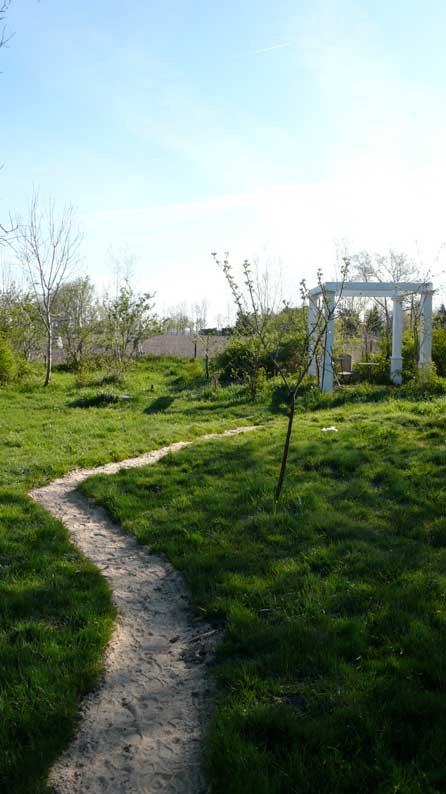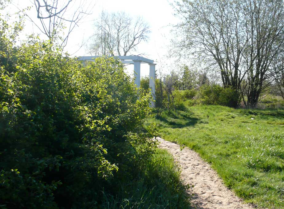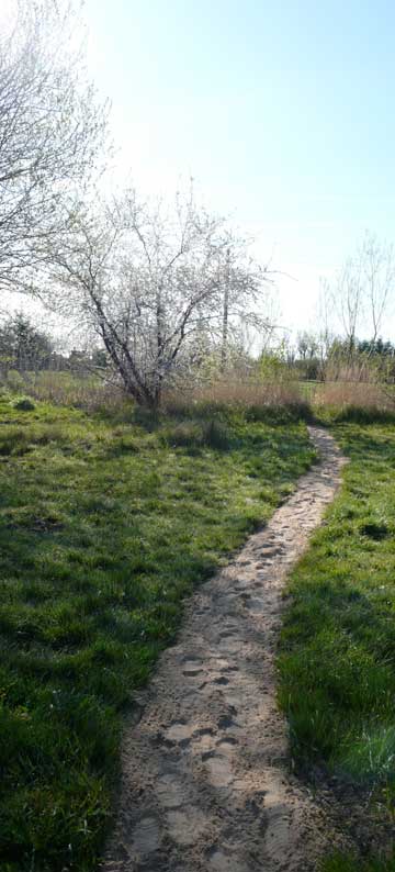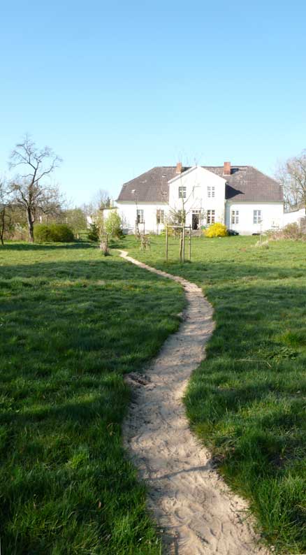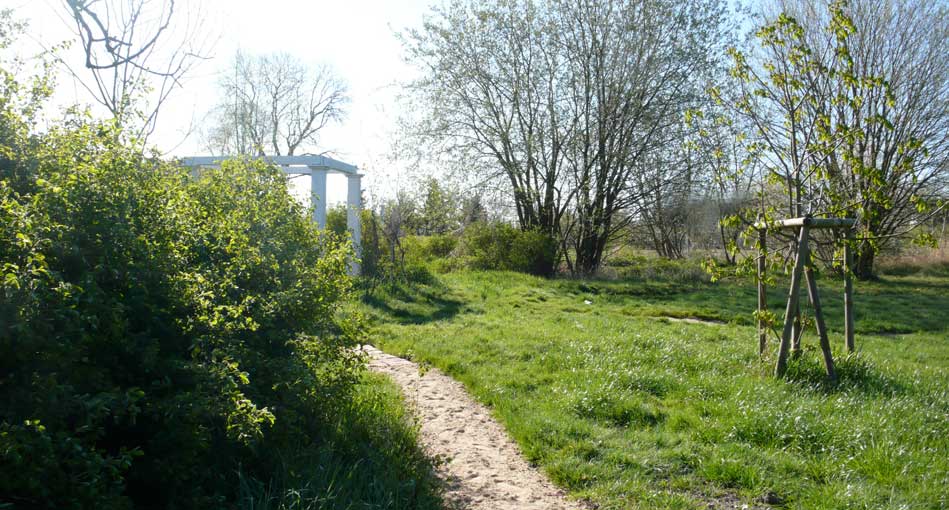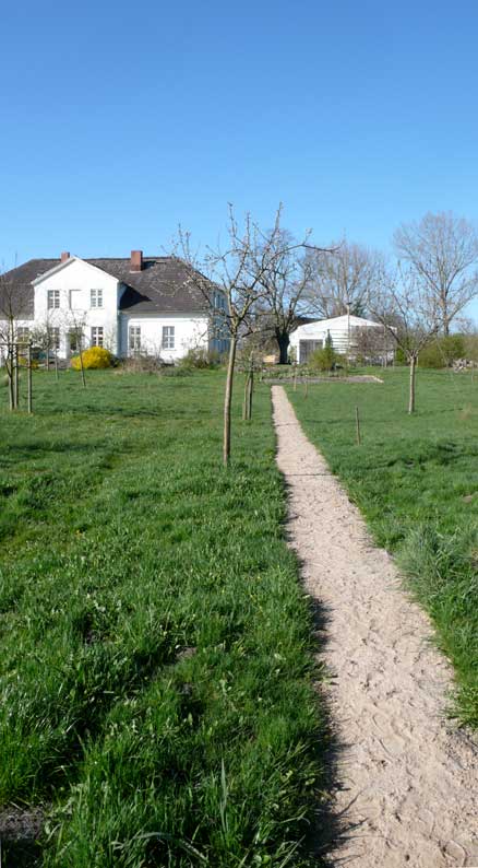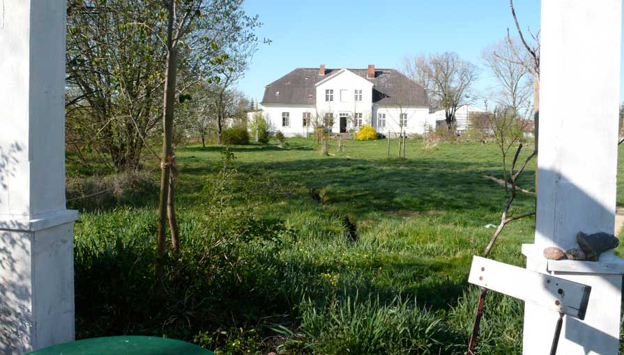 An den ehemaligen Graben unten und zur Rechten zu den Koppeln wieder.