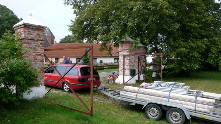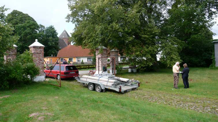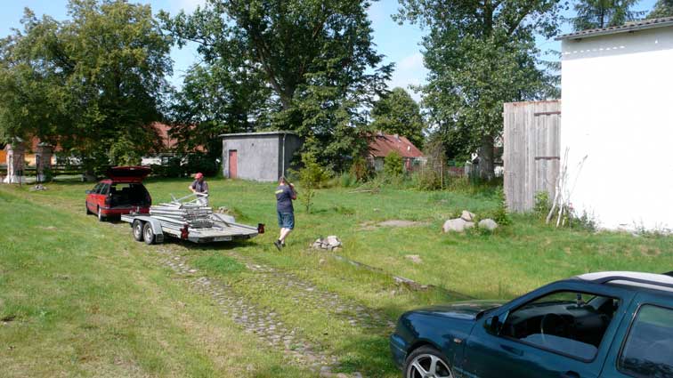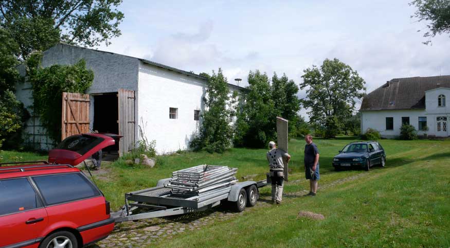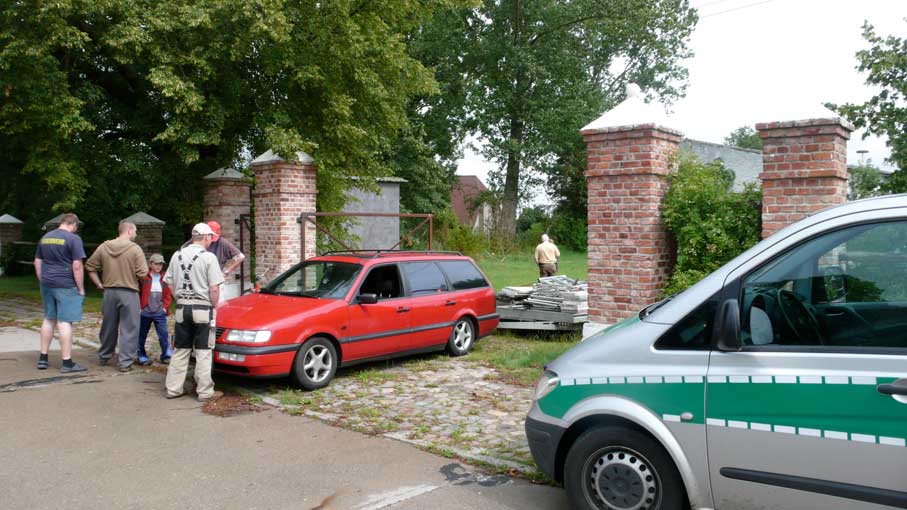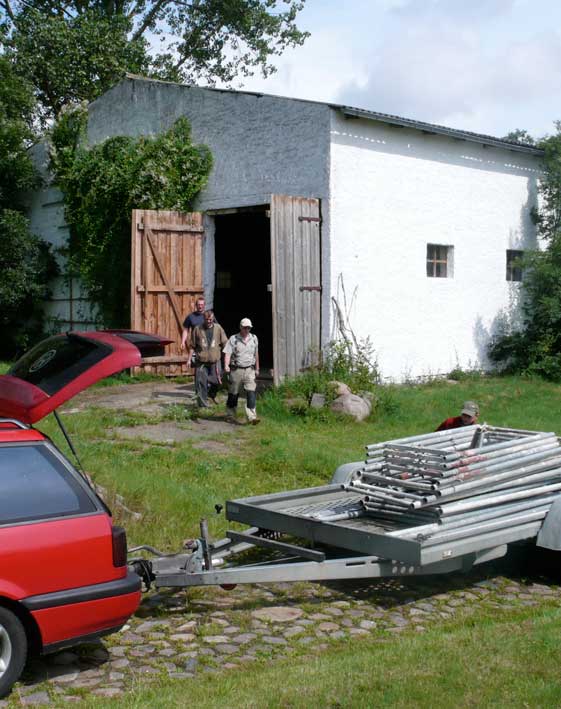 Im Haus sah ich das zweite rote Auto schnell und quer über die Wiese direkt ins nun offene Tor fahren und wusste, was nun passiert. Also raus. Sie hatten schon zu viert die Gerüstteile aufgeladen und waren nicht bereit das sein zu lassen oder zu reden. Aufforderungen und Vorhaltungen wurden mit Hohn beantwortet. Eigentumsprobleme oder Hausfriedensbruch wurden mit Gelächter beantwortet.