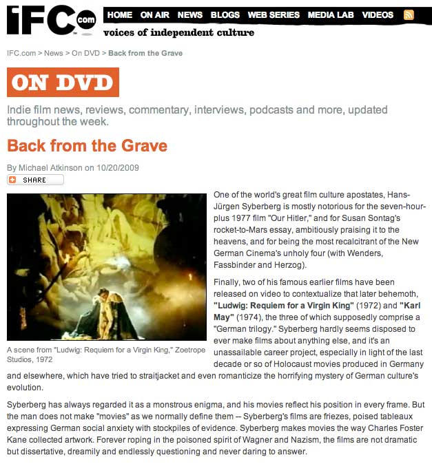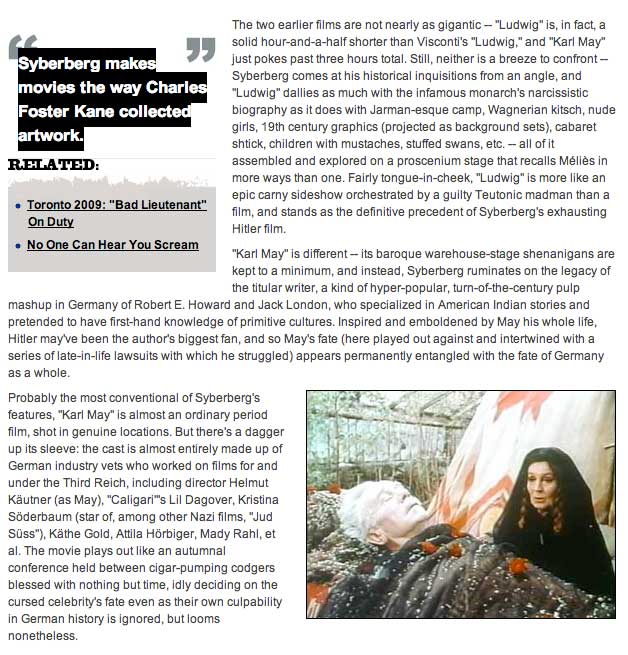 In den USA kamen die Filme LUDWIG und KARL MAY nun auf DVD heraus, dass die Trilogie mit dem HITLER zusammen auch dort komplett ist. In Deutschland hat man diese Kombination mit dem Text von Susan Sontag bis heute nicht erkannt und an den Stellen, die dafür da sind, nicht kommentiert. Es war eine Chance. 20 Jahre nach dem Fall der Mauer und dem Text Vom Unglück und Glück der Kunst in Deutschland. Nun lesen wir dazu die in englisch. Gestern auch die Anfrage diesen Text vor 20 Jahren endlich auch in englisch publizieren zu wollen.