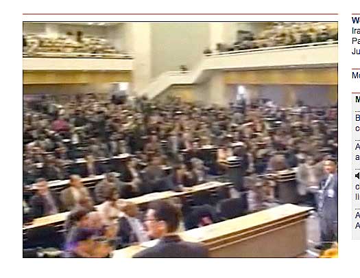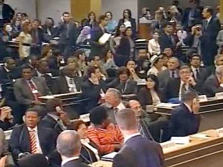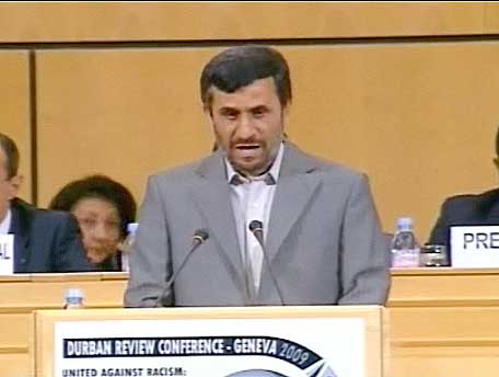 ...... resümiert Henryk Broder nochmal die Ereignisse von Genf: "Wie früher bei den den Konferenzen des ZK der KPdSU war es die Aufgabe der Delegierten, einen Saal zu füllen, damit Knallchargen wie der iranische Präsident ein Publikum hatten, zu dem sie sprechen konnten. In bester Agitprop-Tradition wurde eine Abschlusserklärung per Akklamation einstimmig angenommen. So betrachtet, war die Konferenz ein voller Erfolg. Jetzt muss nur noch geklärt werden, was der iranische Präsident wirklich gesagt hat."