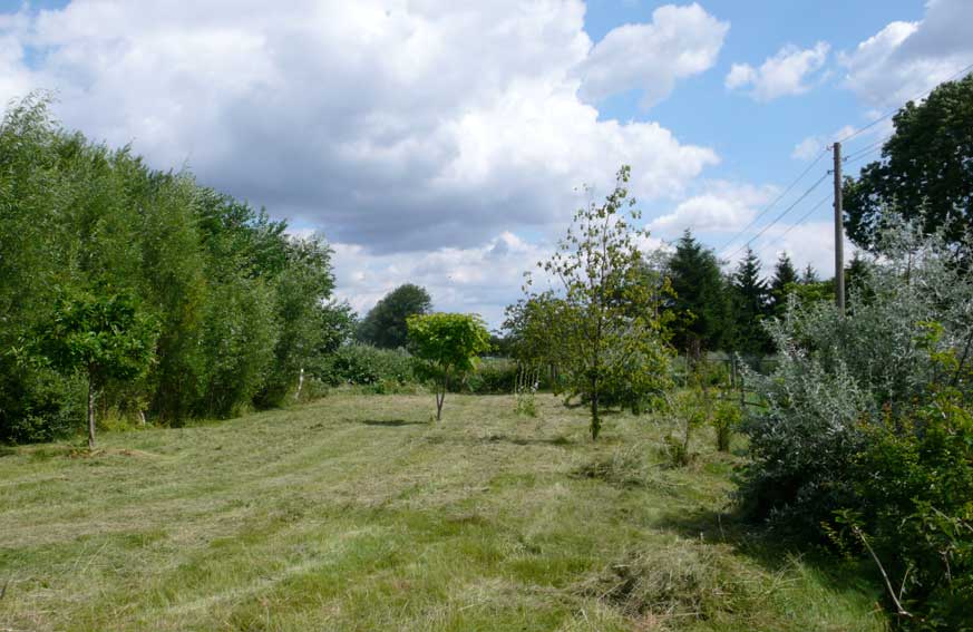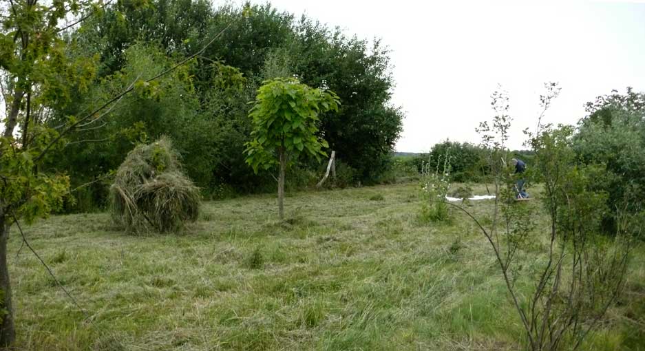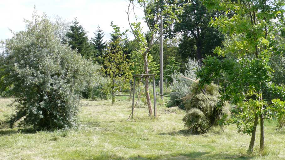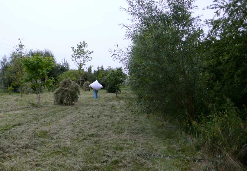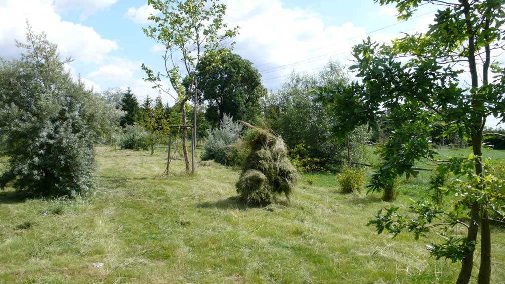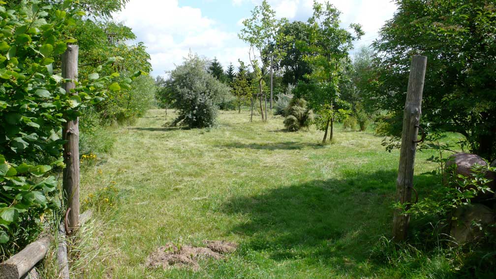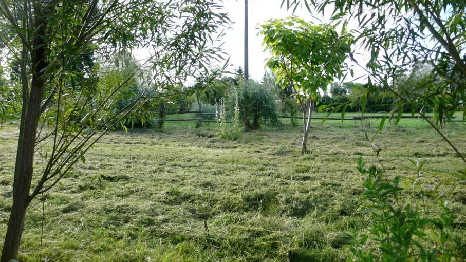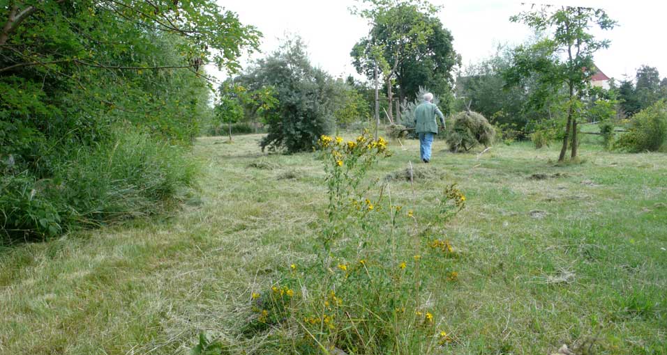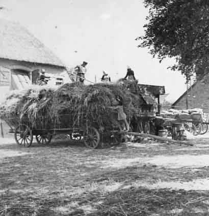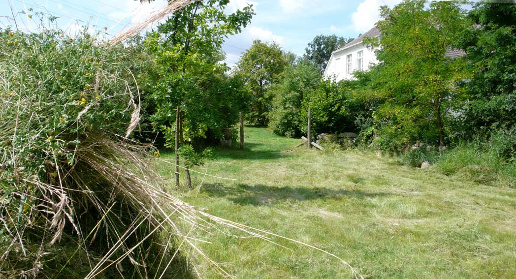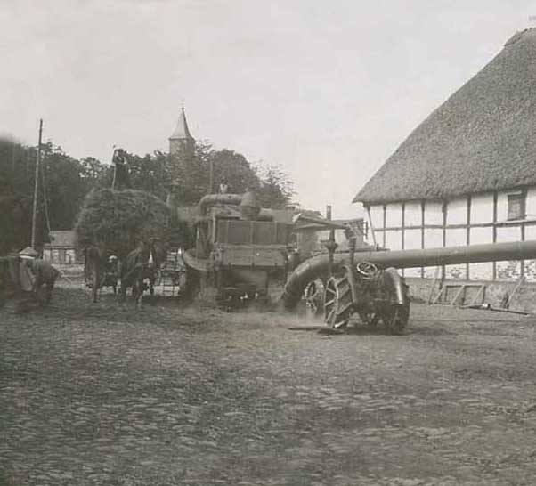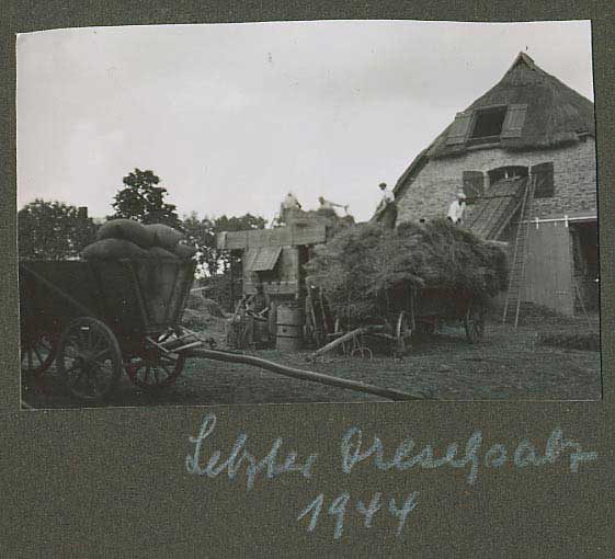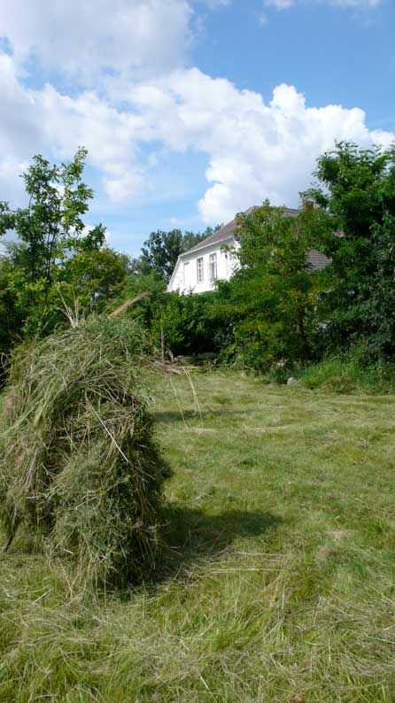 Die Scheune rechts für Stroh der Kühe, so auch links und das Heu für die Pferde. Heute liegen die Kühe nicht mehr, sie stehen die Gülle auskehrenden Maschinen übersteigend von Minute zu Minute ohne Ruhe ohne Stroh und es braucht die Scheunen nicht mehr für Stroh und das Heu, wenn es "Kraftfutter" gibt. Warum gibt es die Kirche nicht mehr des Turms für die Menschen?