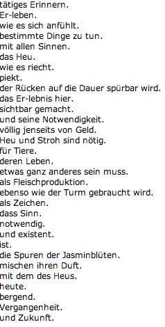 Und wieder liesse sich viel darüber philosophieren. Über den Kultivierungstrieb, die Not wendende Tat und wie hier nun unserer Zeit gemäss, früheren Epochen vergleichbar ein Haus eingerichtet wird mitten hinein in die Geschichte des Fluchs von Vernichtungen und Überlebensdrang durch Generationen und Provinzen von ostpreussischen Flüchtlingen bis rheinischen Neubeginns, im Osten noch einmal ein Versuch. Ohne Land nun aus dem es wuchs. Der Reichtum des Landes aber ist die Vielfalt der verschiedenen Modelle neuer Belebungen und der Mühen und des Glücks es zu bestehen.