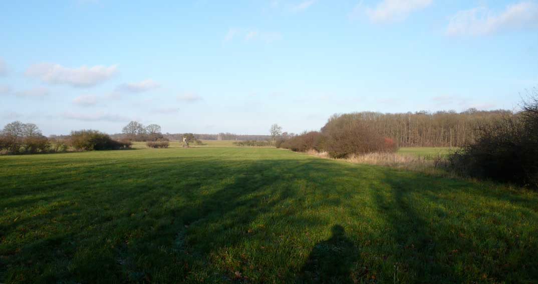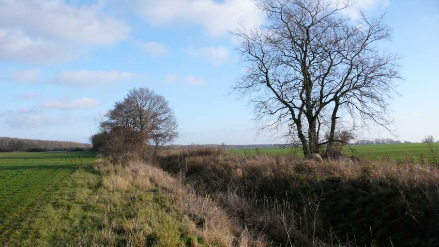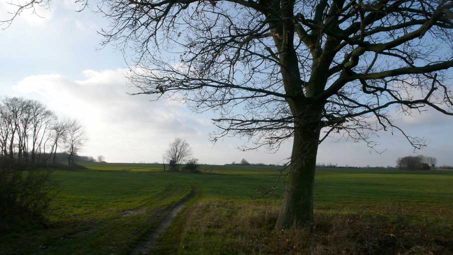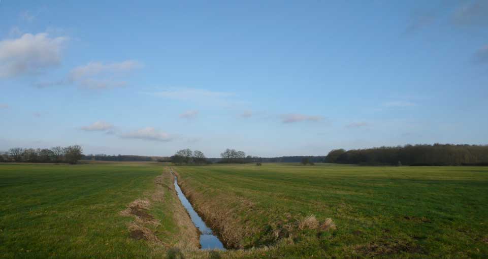 Diese Wiesen zwischen Burg-und Scheidegraben auf dem Weg zur Trebel, aus eiszeitlichem Gletscherland, gehörten früher den Grossbauern des benachbarten Seedorf, die vor der LPG flohen, dass das ganze Dorf nun leer ist von ihnen, jetzt in der Hand eines Holländers, nach der Wende von 89/90, die die Politiker machten.