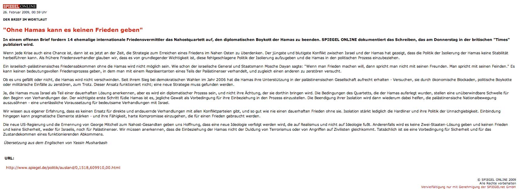 The new US administration and the appointment of George Mitchell as the Mideast Envoy give hope that a new strategy grounded in realism and not ideology will be pursued. Without this, there will be no two-state solution and no peace and security for either Israelis or Palestinians. We must recognise that engaging Hamas does not amount to condoning terrorism or attacks on civilians. In fact, it is a precondition for security and for brokering a workable agreement.
