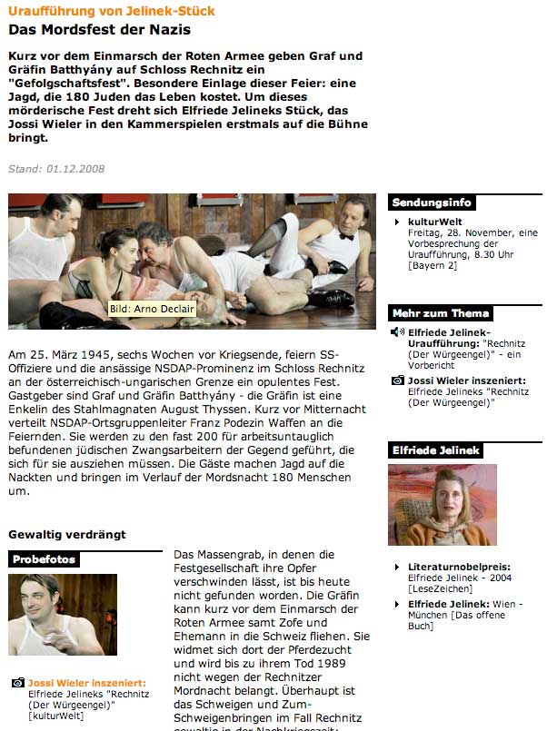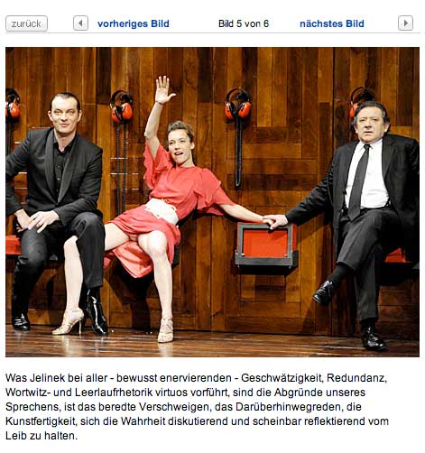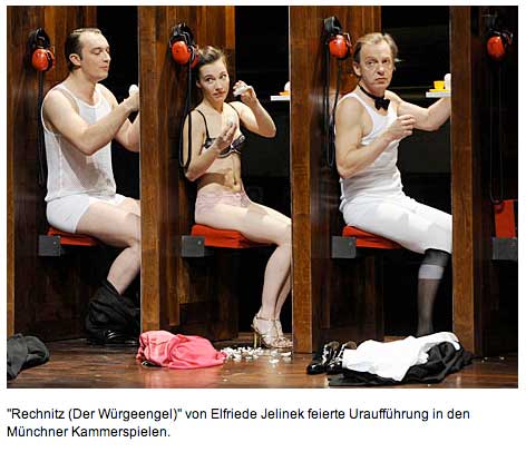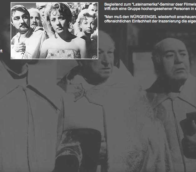 Auf dem Theater(München/Jelinek/Österreich 2008 Rechnitz/Würgeengel gen.)wird grausam, was im Film(Bunuel Würgeengel 1962)noch Leben bannte in Figuren der Welt, die wir in den verlorenen Häusern ahnten oder aus Fotos kennen. Verloren nun auch sie. Die Gesten, Gesichter, Kleider, das Licht, Räume . Gegenstände, Worte und die Menschen letztlich alle. Das Leben zwischen ihnen vorbei. Wie in den Häusern, die nun untergingen mit Tieren und Bäumen und Feldern oder dem Land. Das wir nun immer in Gedanken bewohnen?