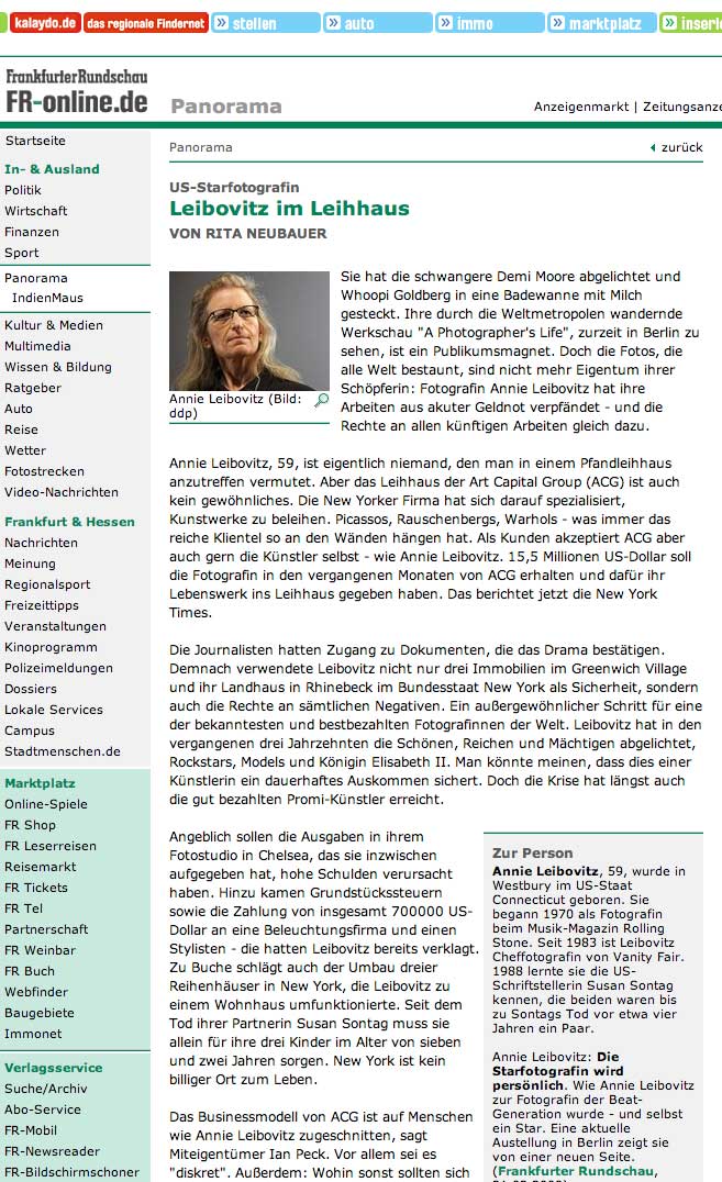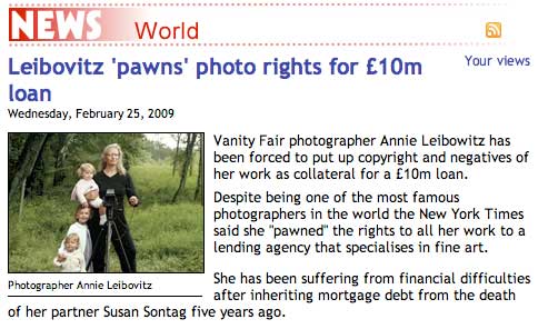 Last fall, Annie Leibovitz, the photographer, borrowed $5 million from a company called Art Capital Group. In December, she borrowed $10.5 million more from the same firm. As collateral, among other items, she used town houses she owns in Greenwich Village, a country house, and something else: the rights to all of her photographs.