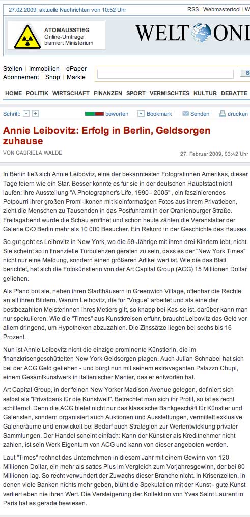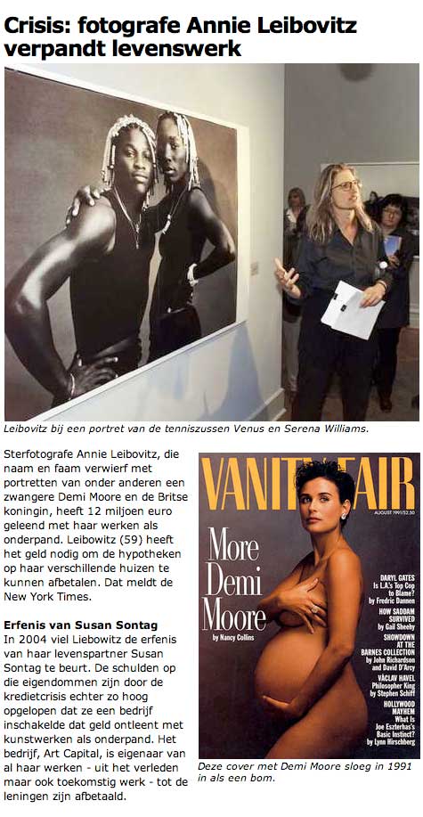 Those who know Ms. Leibovitz said she used the money to pay off mortgages and deal with other financial stresses. But whatever her reasons, she is not alone in doing business with Art Capital and similar lenders. At a time when stock portfolios are plunging and many homes, even grand ones, have no equity left to borrow against, an increasing number of art owners are realizing that an Old Master or a prime photograph, when used as collateral, can bring in much-needed cash.