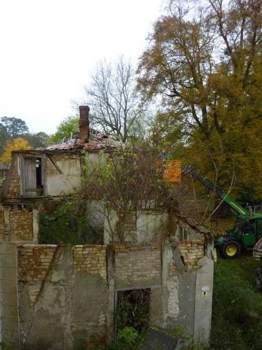 "Sohn Julius steht in dem Teleskopladerkorb und nimmt schon mal vorsichtig die schönen alten Ziegel ab.Der Vater fährt ihn rauf und runter,während Benedikt Freude an der Beobachtung