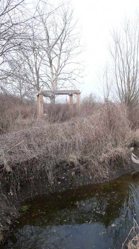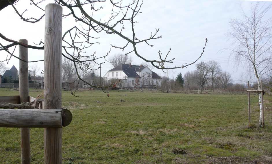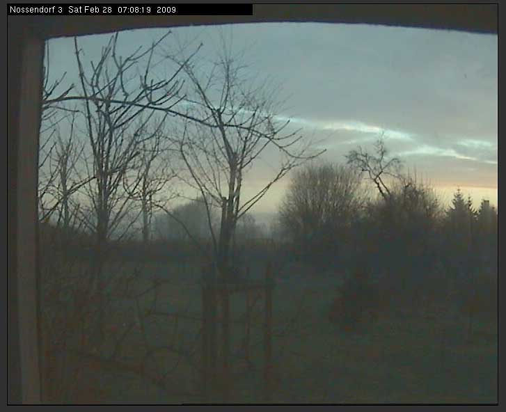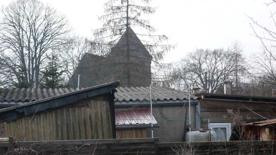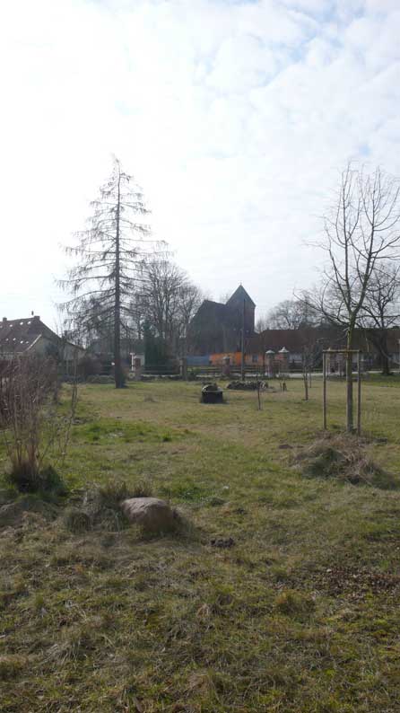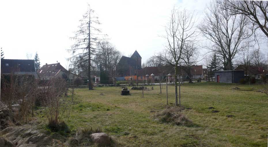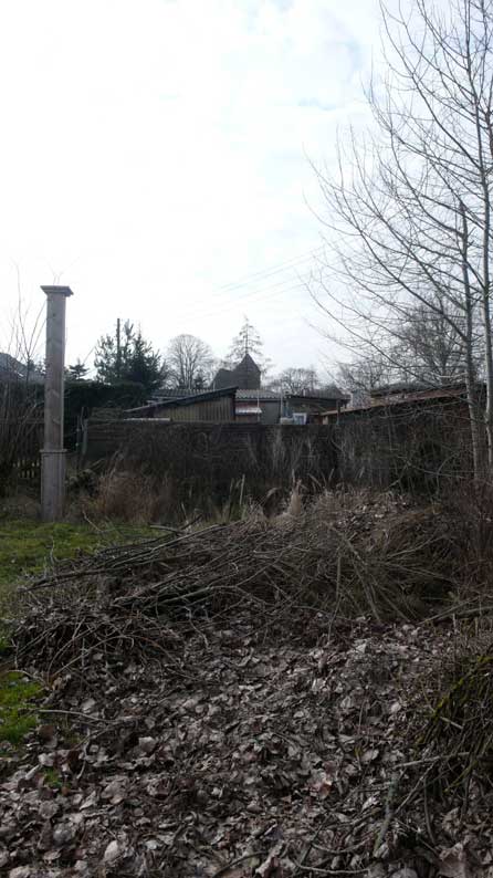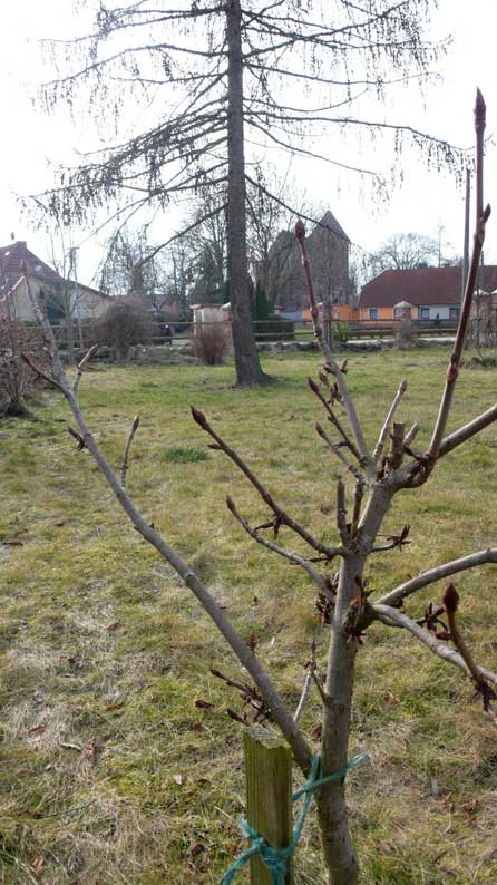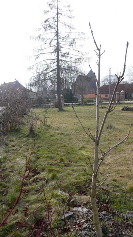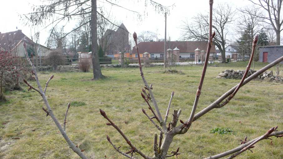 Grün von unten einzig, sonst alles sibrig mit sich füllenden Knospen - Augen. Haus und Kirche, warten wie immer.