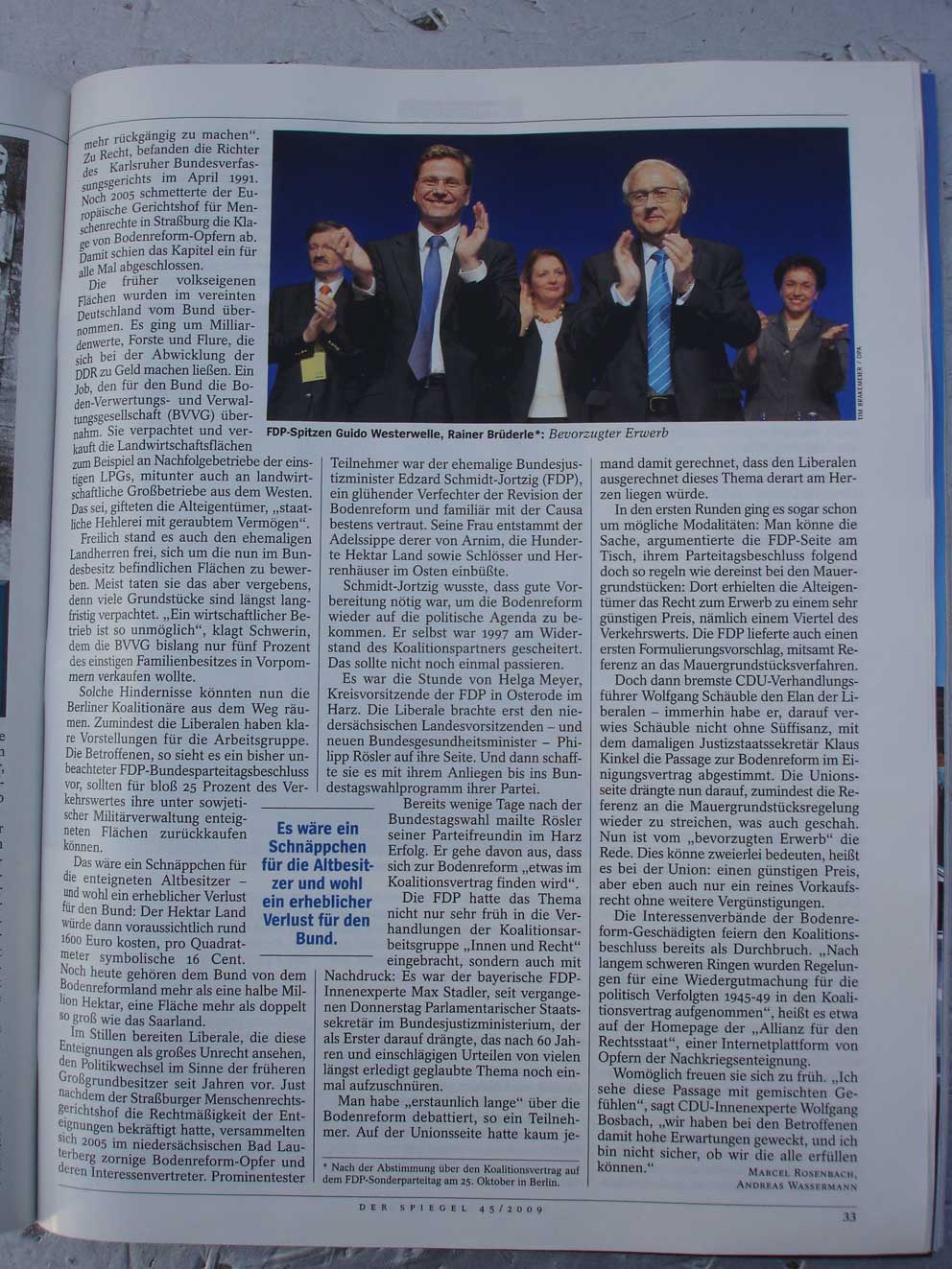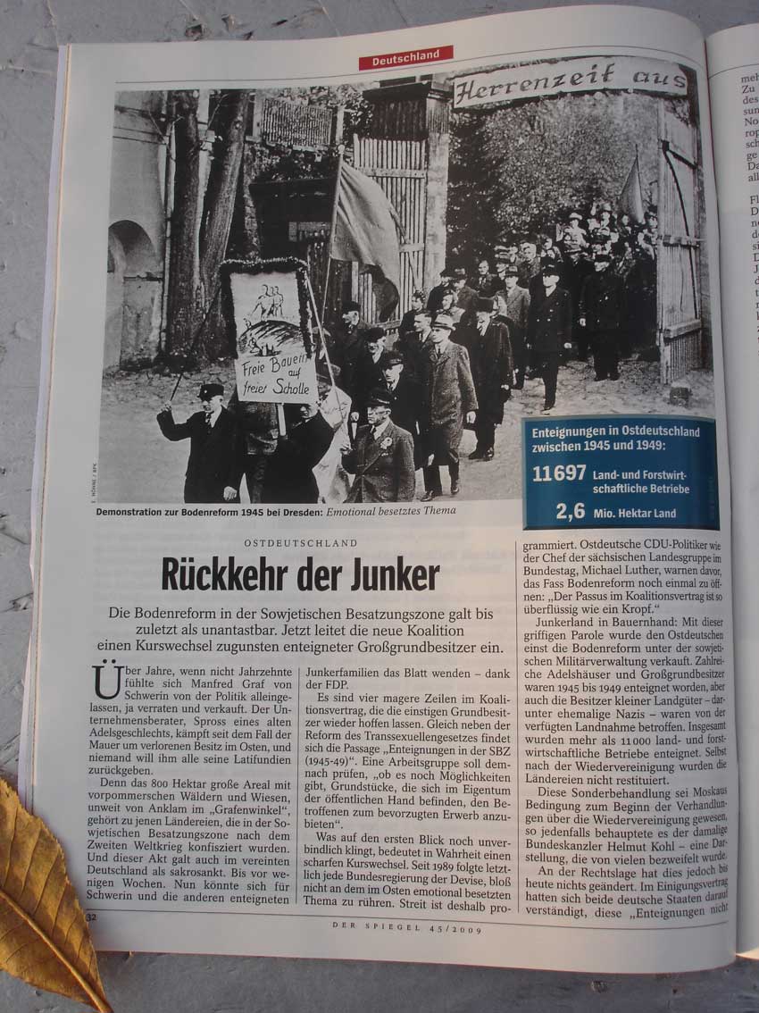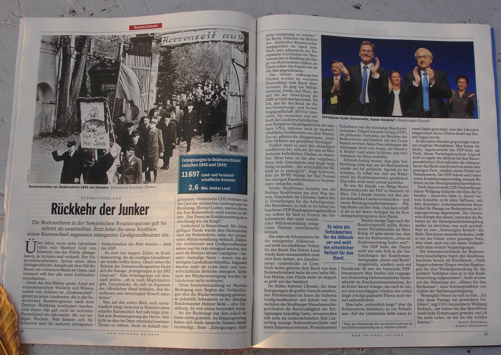 Aus dem Artikel des SPIEGEL wird abermals deutlich welche Brisanz dieses Thema unserer aller Geschichte hat. Es geht um den Verlust der ländlichen Kultur eines Fontanes im Osten, um den Verlust des Rechtsstaates, um Milliarden, die der Staat abkassiert, und die nicht investiert wurden, weil die geschädigten Eigentümer nun nicht aufbauen konnten, was aus Herzblut einzig hätte geschehen müssen,