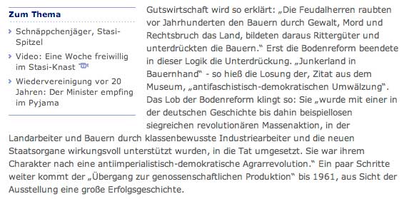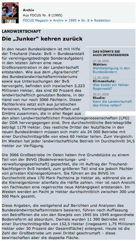 und es geht nicht um soziale Aspekte armer Reformbauern, sondern um Geschäfte mit Brüssler Subventionen in der Hand der ehemaligen LPG-Bereichsleiter, die heute das Mehrfache der früherer Flächen sogenannter Grossgrundbesitzer unter dem Pflug haben, ohne Kulturverpflichtung die Häuser und Höfe der Güter damit zu retten und zu versorgen.