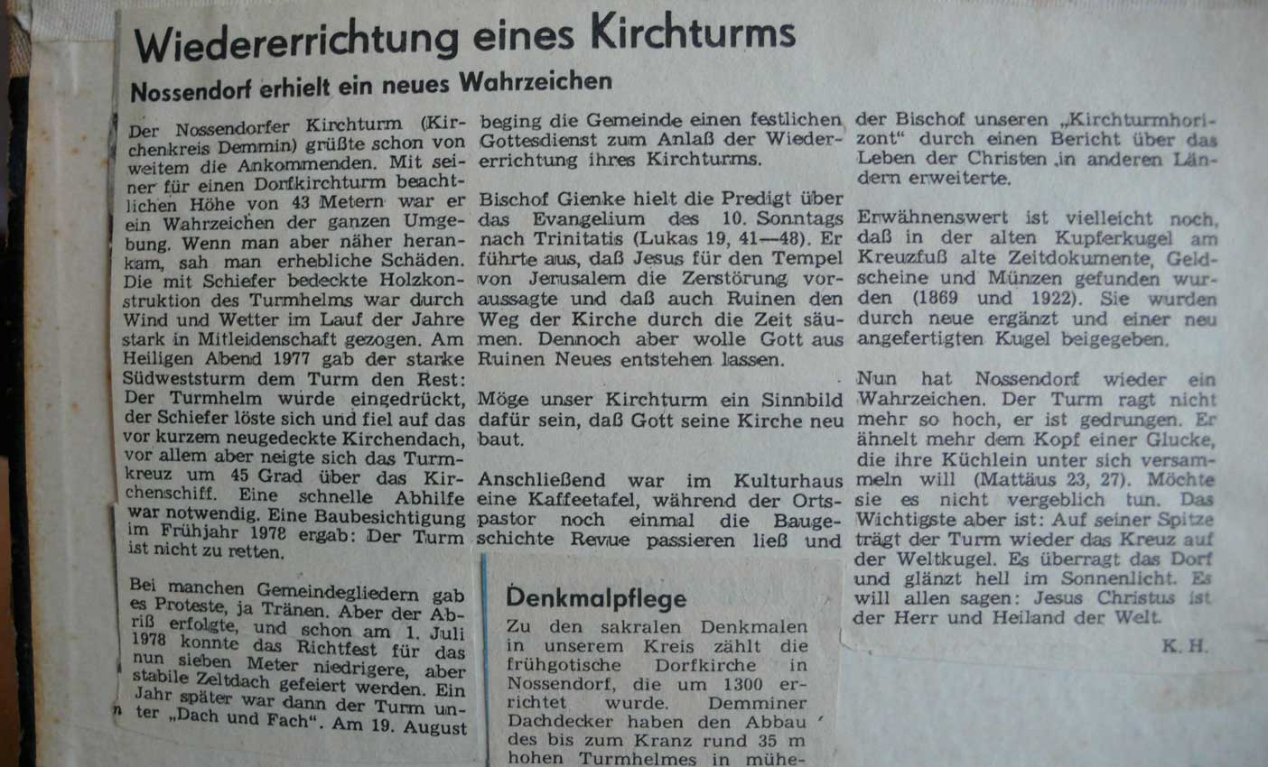 Seltsam, dass der DDR-Kunstführer vom Bezirk Neubrandenburg zu der Nossendorfer Kirche alles erzähl,t aus 800jähriger Geschichte, was sich veränderte, nur aus jüngster Zeit das Verschwinden des Turms nicht. Das Bild zeigt die heutige Ansicht ohne Anmerkung eines Vorgängerturms. Auch Fotos vom Abriss waren nicht aufzutreiben, nicht in den Büchern der Kirche und so nicht vom vorigen Patsor damals H. der für seine Fotoleidenschaft bekannt ist.
