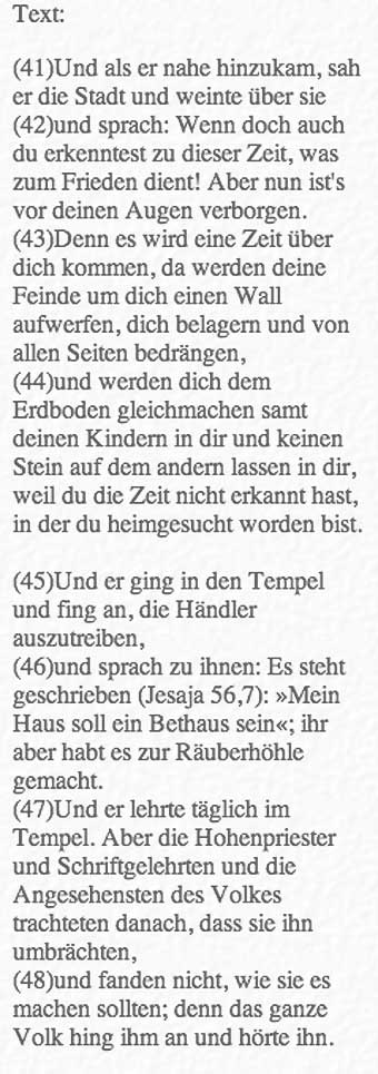 41Und als er nahe hinzukam, sah er die Stadt an und weinte über sie 42und sprach: Wenn doch auch du erkenntest zu dieser deiner Zeit, was zu deinem Frieden dient! Aber nun ist's vor deinen Augen verborgen. {Lukas.13,34} 13,34