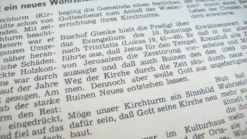So ergab sich eine Kette, die ineinander griff. Immer noch hier das Mauern, der Sturm und wir haben nichts und wissen nichts wie wollen es nicht. Schon gar nicht, wenn es von aussen kommt. Jetzt lesen wir in der Zeitung von damals, dass nicht der Sturm den Turm gefällt, dass zwischen Sturm und Abriss ein viertel Jahr zum Nachdenken und Entscheiden blieb, dass nicht der Turm katastrophenartig aufs Dach gestürzt ist, sondern einige Schiefertafeln gefallen waren und nur das eiserne Kreuz von ca 80 cm schief gestanden sei. Und wir lesen von Protest(!) der Gemeinde(!) und Tränen. Also nicht die glückliche Rettung in der Not durch den LPG-Beloruss aus Volksdorf als Mithilfe aller zusammen in der Not. Stattdessen Protest und Trauer. Und Versuch zu verhindern also und Ohnmacht derer denen es um was ging.