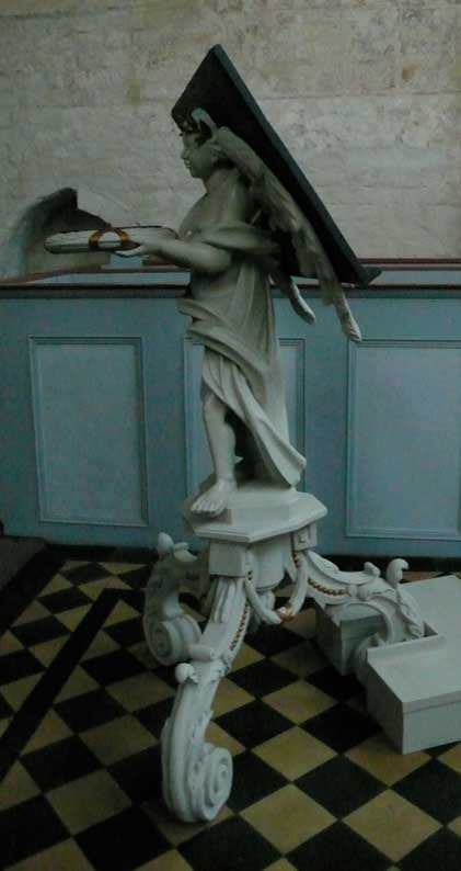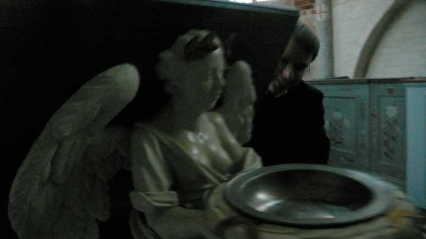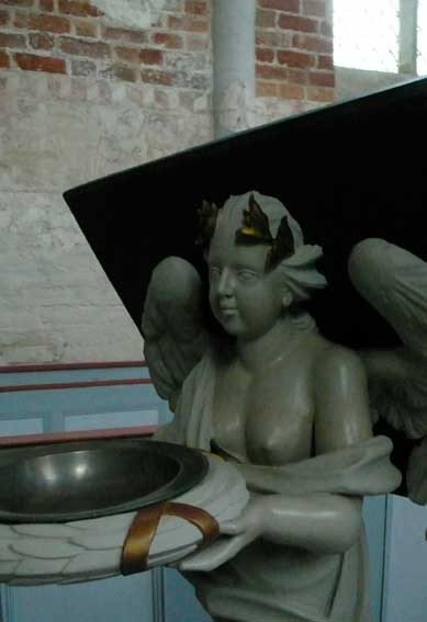 Den Taufengel hat er wieder eben gerade im Sommer wieder restauriett und aufgestellt. Vprne das wasser, hinten das Buch und das Wort. Nu hundert Jahre und nur dort gemacht, in dieser Weise.