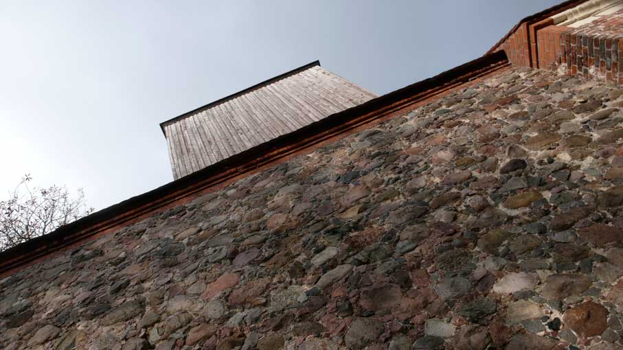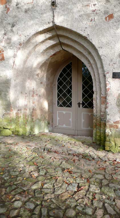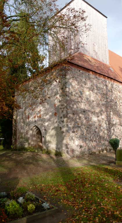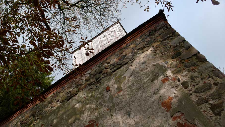 Auch hier der Turm, die Spitze weg, muss, wird wiederkommen. Solange der Pastor Kneisel da ist. Schon so in Nehrungen und wo er ist.