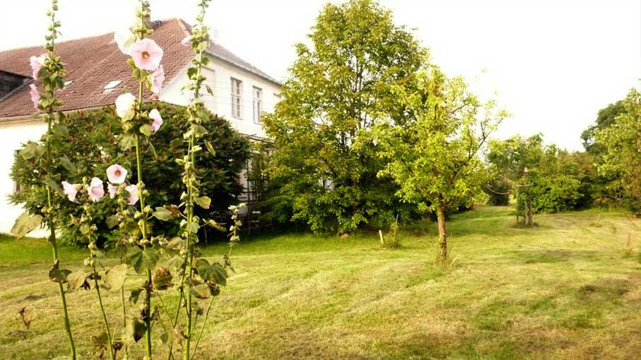 überall hier standen Ställe, Pferde und Kühe und Tauben, Hühner.