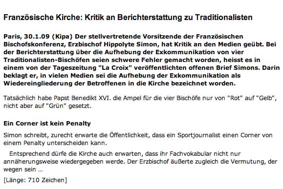Kleiner Blick zur getreuen Tagespost, des Papstes Lieblingsblatt aus Deutschland, und siehe da, was, wenn dieser Erzbischof aus Frankreich richtig erklärt, was wollen sie dann vom Papst. Die 4 Ausgestosseneni sind wieder zugelassen, als reuige Sünder in die Kirche zu kommen, aber ohne Amt und Würden, blosse Mitglieder wieder der Gemeinde und wie jedermann mit Fehlern und Sünden. Küng müsste das verstehen, Kardinal Lehman oder Schörnborn, honorige Kenner, spielen mit, wenn der Weltrefelex aufjault nach schalem Ritual, als ob da Unheil sich nähere? wie jene deutsche Kanzlerin vor betretenen Gesichtern rundum peinlich wieder Punkte sammeln will, wo denn - noch immer bei denen, die die Welt vor ihr sich Gericht wünscht? während die anderen neue Gelegenheit erhelten zu mahnen. Diesmal nun an Obama, den einzigen noch, auf den es ankommt. Von Al Kaida direkt. Der Dialog global über alle Grenzen.