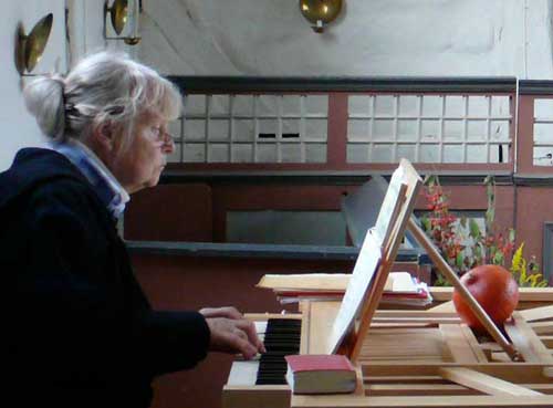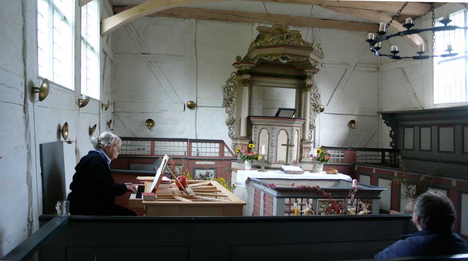 mit sicherem Griff die neuen Lampen an Wänden und von der Decke, die Kerzenständer auf dem Altar. Neu und passend aus dieser Zeit.