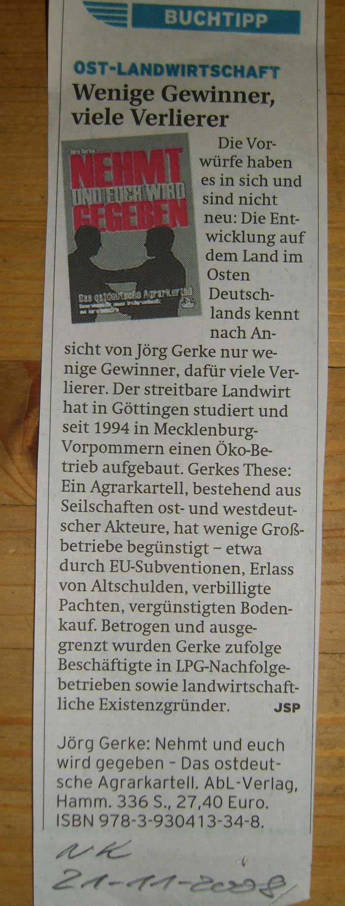 Wenn für die Wiedervereinigung Deutschlands die Aufgabe des Grund-Rechts auf Eigentum im Osten nötig war, dann warum und von wem gefordert als Bedingung, und wer hat darüber befunden und mit welchen Worten hat man sich an alle gewandt, beim Bruch der eigenen Rechte. Ein soziales Motiv ist auszuschliessen, denn die Flächen um die es ging im Osten in der grösse ganzer Länder, sind heute in der Hand weniger ehemaliger LPG Funktionäre ohne Kulturverpflichtung, etwa Erhalt oder Widererrichtung der dazugehörigen historischen Bauten(Gutshäuser, Stallungen, Höfe, Schlossanlagen, Kirchenpatronagen). Stattdessen fliessen grosse Subventionen aus Brüssel in die Flächenbearbeitung mit Chemie und Massentierproduktion(Schweine-und Hühnerfabriken), die Dörfer verelenden durch Arbeitslosigkeit, Landflucht und falsch angewandte Dorferneuerungsprogramme aus Brüssel in Billigbau(Dämmung) und sozialistischen Strukturerhalt(Plattenbau statt Kirchenren.). Verwaltung und politische Strukturen werden ohne demokratischen Kontrollen von denen bestimmt, die die Flächen subventioniert erhalten, unter Bruch der Auskunftspflicht einer Offenlegung ihrer Subventionen in Millionenhöhen. Der Bürgermeister und Gemeinderat nach dem Muster der Einheitsliste ohne Gegenkandidaten werden von oben(LPG Struktur ) bestimmt. Man sehe die Menschen an und man weiss, noch die DDR wäre ihnen lieber(Landrat: Die Linke aus der Blauhemdfraktion ohne Kultur- und Geschichtsinteressen ). Die Kirchen, in der DDR als hilfestellendes Kontrollorgan und als Institution auch durch manche Widerstände von unten respektiert, ist durch marktwirtschaftliche Mengenanalyse ohne Relevanz erkannt und ausgeschaltet, hat sich selber aufgegeben. Die Beobachtungen aus der Verwaltung dieser Konstellation zeigt vernichtende Ergenisse in der Wegrationalisierung von Bäumen, Wegen, ohne demokratische Normen, tote Dörfer mit leeren Häusern. Wer wissen will, wie Die Linke an der Macht ist, muss hierher kommen. Die Kirchen stehen vor der täglichen Frage mitmachen oder den eigenen Weg gehen, Halt geben im sichtbaren Fall. Alles, was als Kultur geschieht, geschieht dagegen. Es ist wie ein Fluch, der über allem lastet.