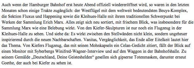"Die italiensüchtigen Kritzeleien des Cy Twombley sonnen sich nun in der Nachbarschaft Michelangelos; Gipskopien seiner 'Sklaven' machen es möglich. Und wie kann man das deutsche Drama bei Anselm Kiefer gespentischer kommentieren als durch Hans Jürgen Syberbergs Interviewfilm mit der 1975 noch hochfidelen Winifred Wagner? Genussvoll erzählt die Greisin von ihren Begegnungen mit Hitler in Bayreuth, dem sie im Dritten Reich als Prinzipalin vorstand."