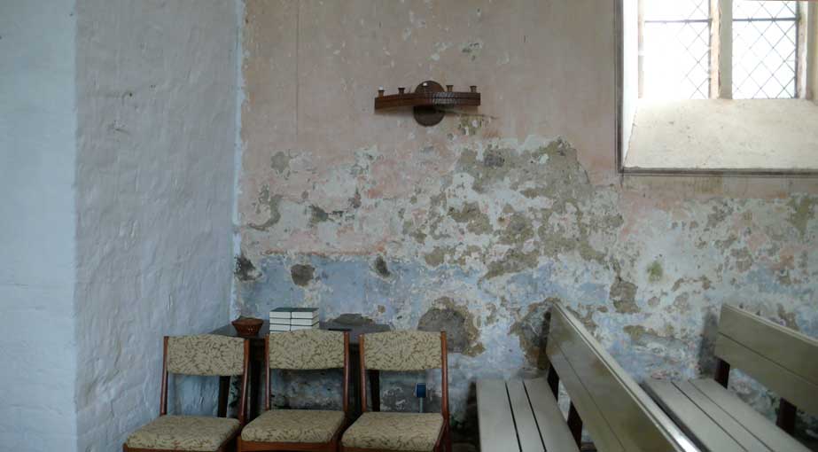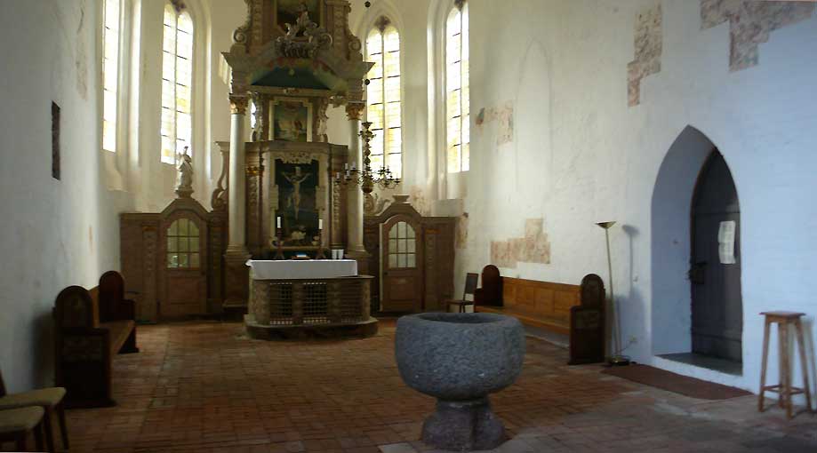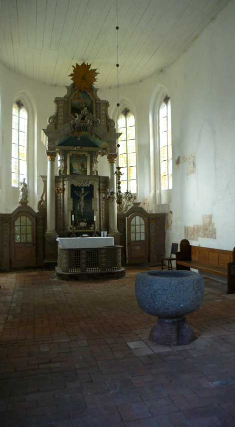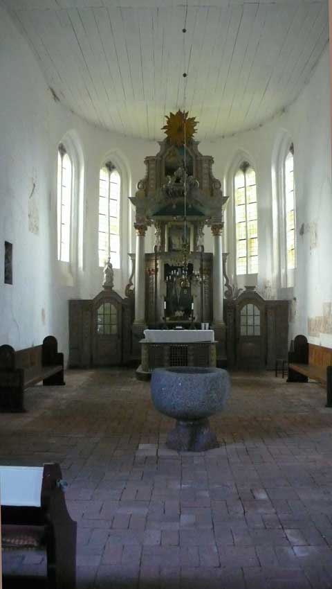 Die Kirche in Nossendorf nach der Entfernung der DDR-Kontaminierung in dem 2004 wiederhergestellten Chor in der historischen Fassung .