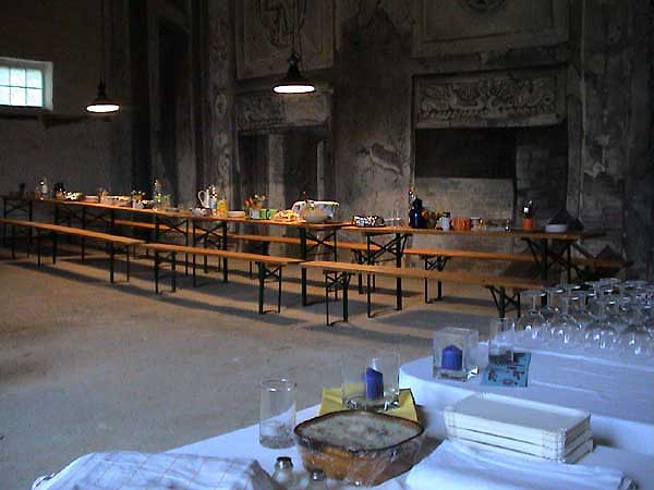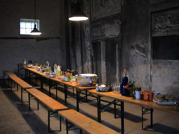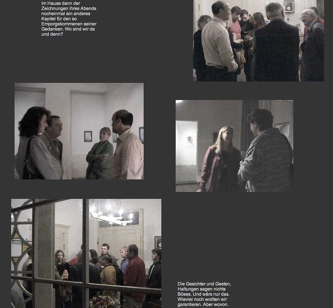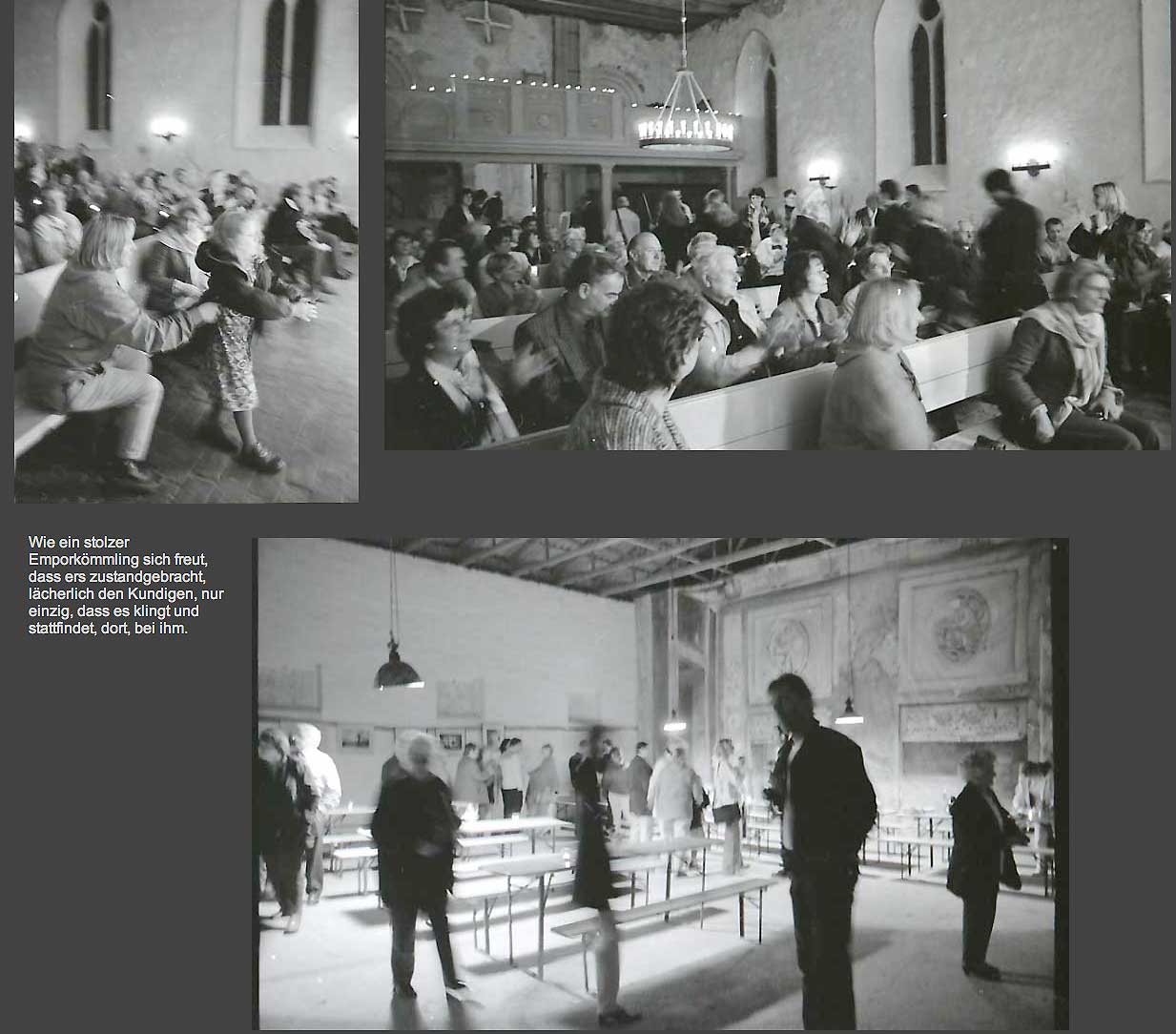 Hintenrum sei auch eine Möglichkeit zu gehen. Über Beton und um die Ecke. Ohne mich. Wie gesagt, bei solcher offen erklärten Feindschaft, von den Ämtern in Demmin bestätigt, würde ich nicht mehr zur Verfügung stehen. Turm- Restauration und Langschiff fertig mit privaten Geldern, gerade geplant, nein. Feste im Haus danach nicht mehr. Tagebuch, jetzt täglich an die 6000 Besucher proTag, an die 7 Millionen insgesamt zu Nossendorf, zu Ort und Leben, dagegen dann. Und diese wollen in den Touristen-Kreis am Müritzsee eines sanften Tourismus, Nossendorf und Trebel als Hinterland ohne Gaben, ohne was mitzubringen, was zu sein? ausser Landflucht, Begünstigung derer, die sichs nehmen und verteilen unter sich, ohne Erinnerung und Zukunft, mit einer Gegenwart ohne Wert. Wer will die haben. An den Fleischtöpfen des Tourismus, solche? Sie müssen sich also entscheiden. Letzte Instanz ist der Landrat in Demmin. Dorthin wird es nach 8 Wochen kommen. Vorher noch jene, die jetzt alles ausarbeiten, die Pläne auslegen und dann Anmerkungen einsammeln, begutachten und Empfehlungen geben, nach Wirtschaftlichkeit sagen sie, nichts von Historie oder Wohl für die Gemeinde, wie es im Gesetz steht, sagen sie. Wirtschaftlichkeit ohne Gäste? ohne Kultur? und ohne die, die hier das Land weitertragen, ernten und säen auf ganz andere Weise? Wir werden sehen, alles tun, dass sie nicht sagen können, wir hätten uns nicht bemüht. Alle meine Gäste gingen diesen Weg aus Finnland, Amsterdam, Maine in Amerika, Tokyo, Berlin und Schwerin und Rostock, Münster und Wien oder Paris, hier liegt der Schlüssel der Kirche nicht ohne Sinn. Alle sind sie dort gegangen, weil es dieser Weg ist und war und sein soll, ein Gedanken-Weg, geistig, wie auf jenem 8mm Film zum Schulanfang mit Gerhard Suhrbier, den Schulranzen auf dem Rücken und heraushängende Lappen zur Tafel, nichts wert? Humankapital nennen das die Tourismusmanager aus Brussel von Leader 2, wenn sie Investitionen überlegen, heutiger Art. Nein, solche Geschäfte, höchst fragwürdige Geschäfte ohne Legitimation durch die Gemeinde, wie die der zwei Fliesenleger als Bürgermeister und heutige Wegzerstörer, können diese Gäste und Besucher nicht bieten, nur ein Markenzeichen und ein Kapital, wofür Nossendorf nun steht, und hier die haben es in der Hand. Alle die, die im Haus hier und in der Halle der ehemaligen Scheune nach den Konzerten und Einweihungen sich versammelten, gingen diesen Weg, nein nicht zum Kulturhaus der LPG in ganz andere Richtung auf Beton, dem Beton der Mauer- was wohl lieber gewollt wäre, von denen, die nun darüber befinden-, sondern hierher, und zwar alle auch aus dem Ort, die hier gearbeitet haben und die Kinder und Nachbarn von hier und der Ferne, immer, wo man reden kann und ganz anders, weil sie die Gäste sind, die das tun und können auf solchen Achsen.